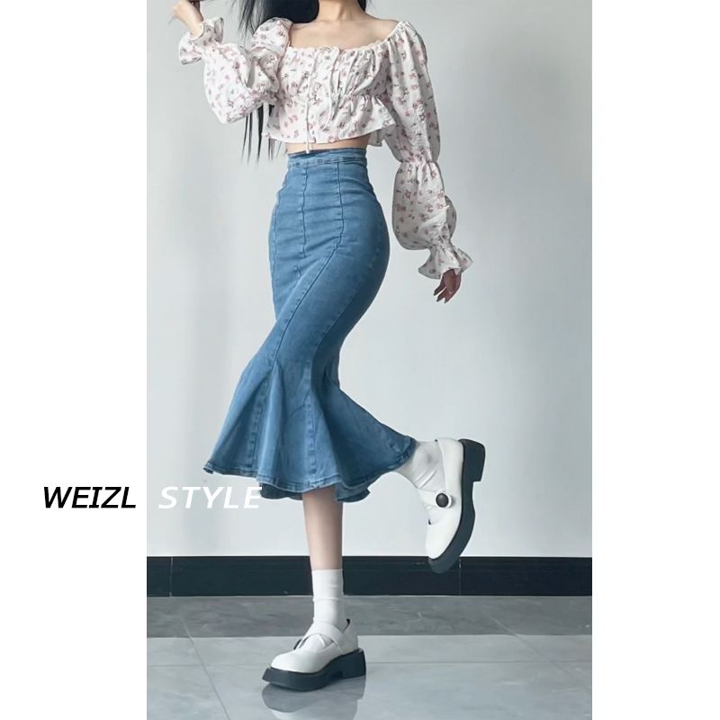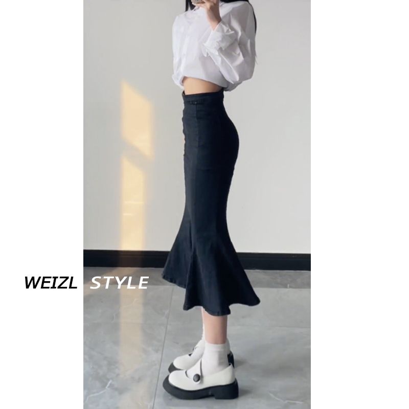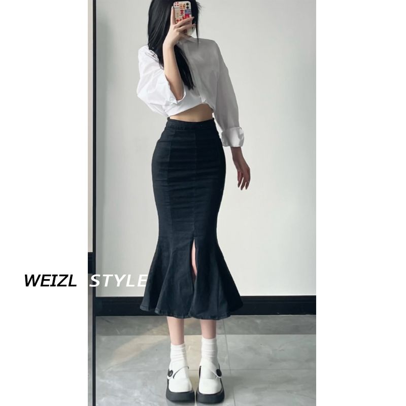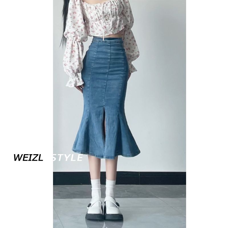 FA44512# 辣妹高腰牛仔鱼尾裙女秋季新款设计感开叉包臀中长款半身裙 服裝批發女裝批發服飾貨源