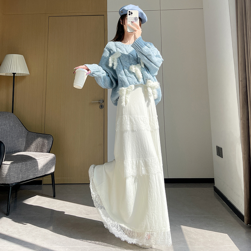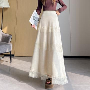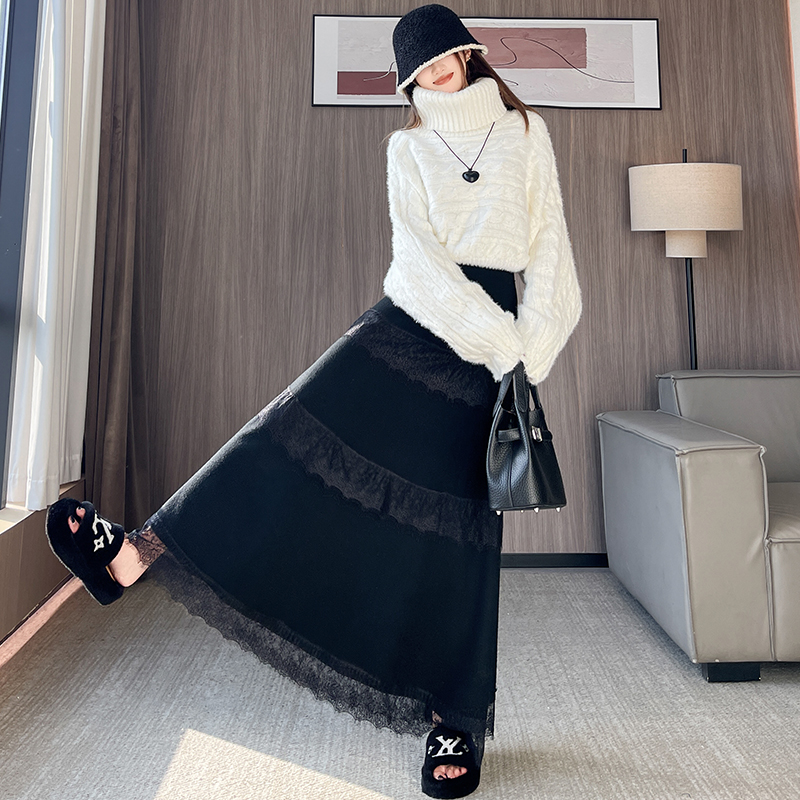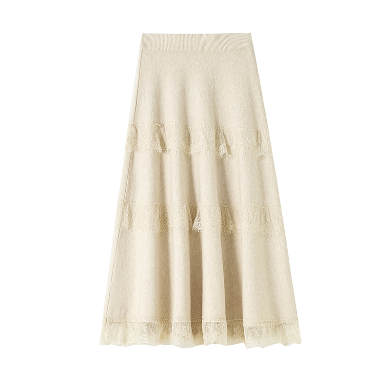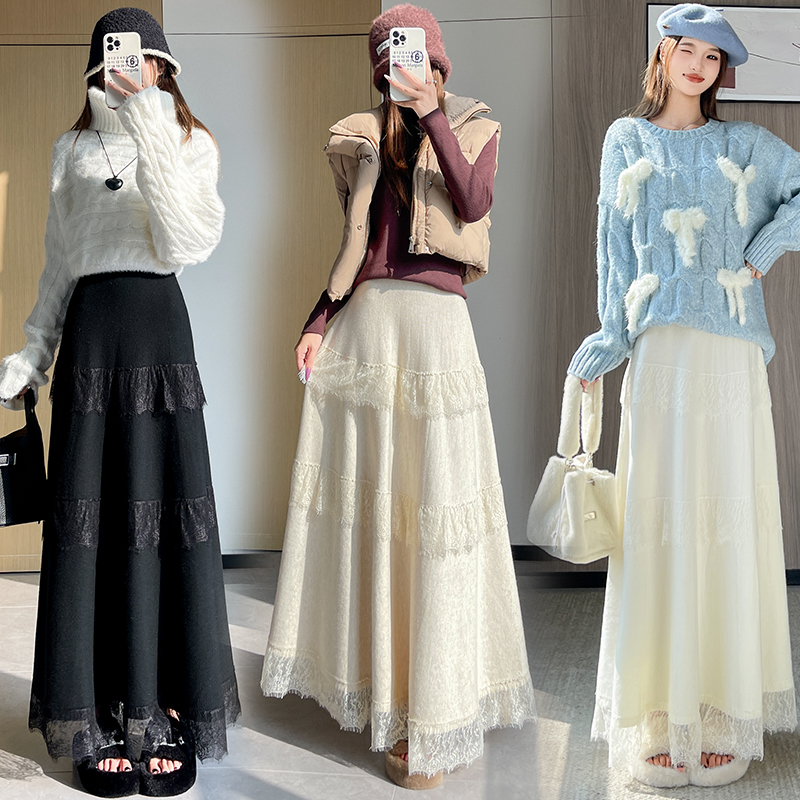 FA44544# 蕾丝针织半身裙女秋冬新款中长款高腰垂感A字大摆蛋糕长裙子 服裝批發女裝批發服飾貨源