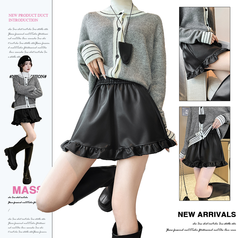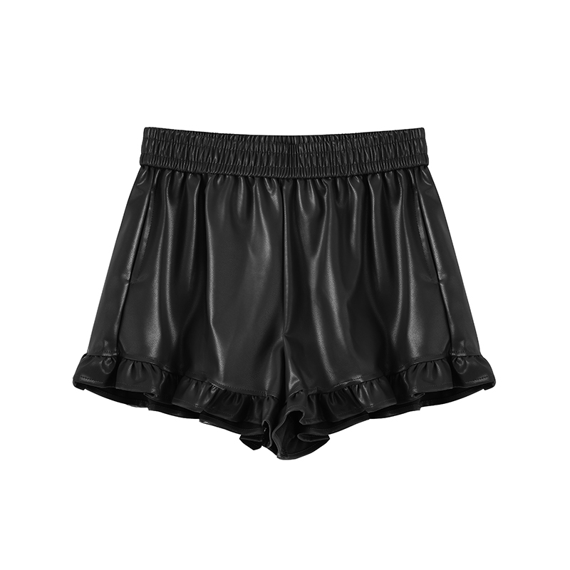 FA44545# 黑色木耳边PU皮休闲短裤女秋冬外穿气质百搭款式显瘦阔腿短裤子 服裝批發女裝批發服飾貨源