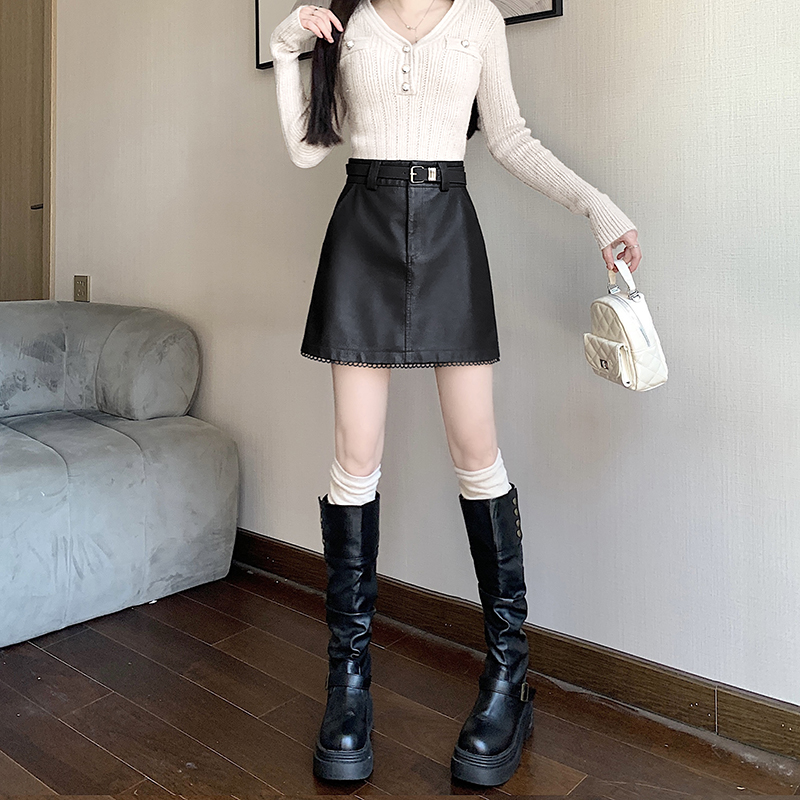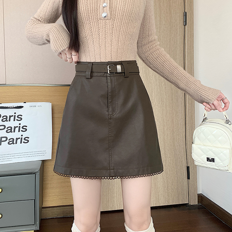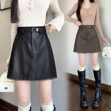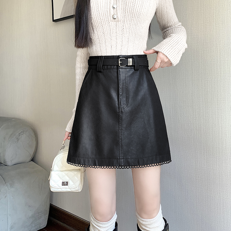 FA44547# 新款秋冬洗水PU皮拼接花边皮裙防走光高腰皮裙A字裙 服裝批發女裝批發服飾貨源