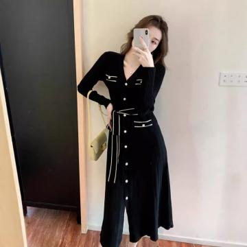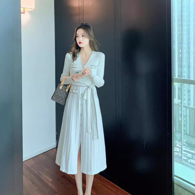 FA44829# 温柔风高级感白色连衣裙秋冬新款法式收腰显瘦气质V领针织裙 服裝批發女裝批發服飾貨源