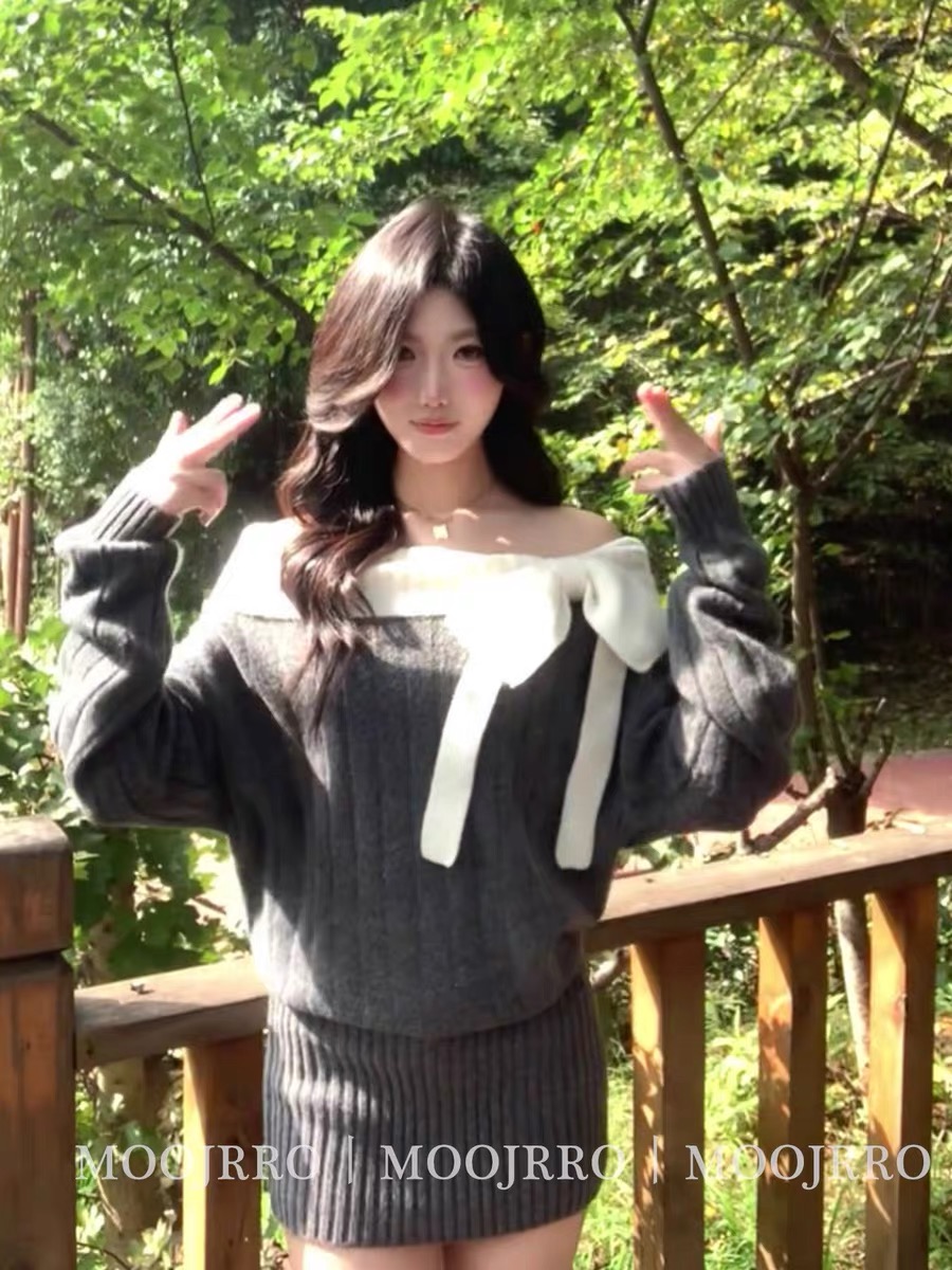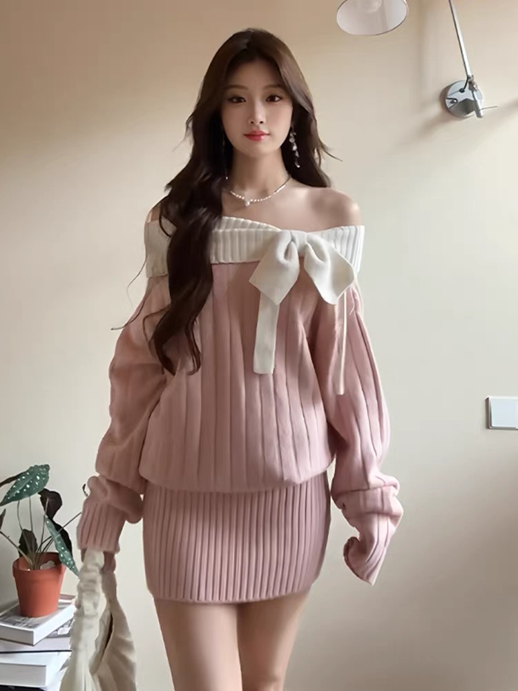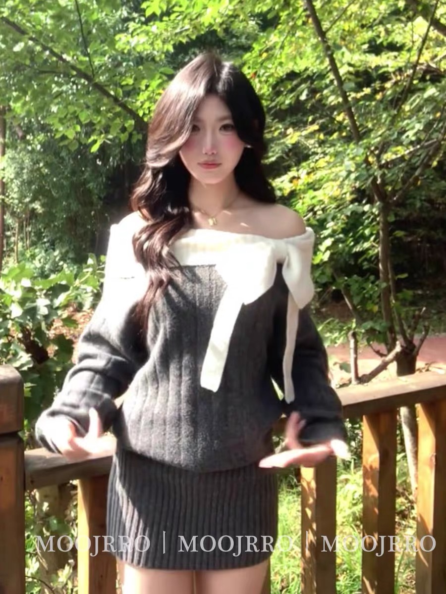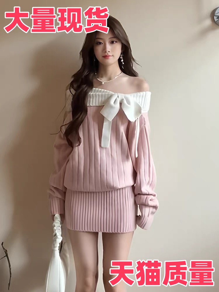 FA44961# 韩系蝴蝶结一字肩长袖连衣裙女秋冬名媛气质宽松显瘦纯欲包臀短裙 服裝批發女裝批發服飾貨源