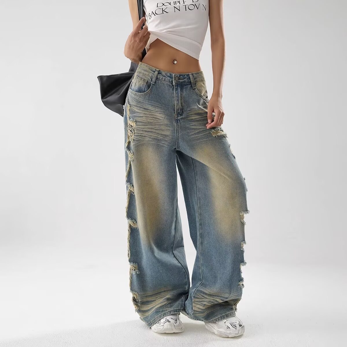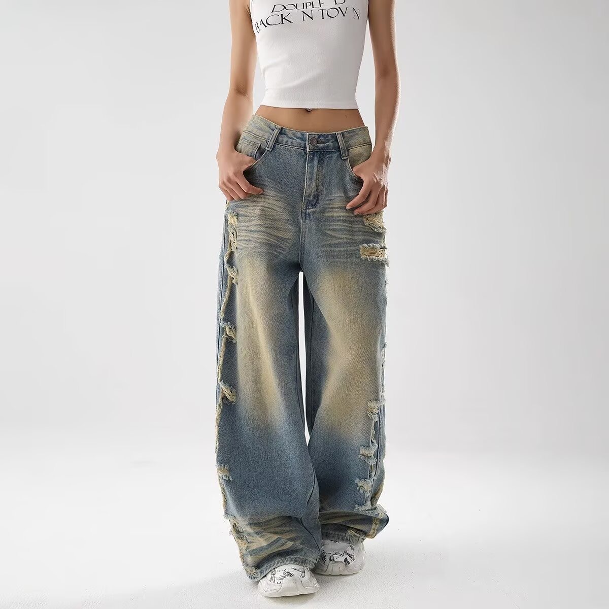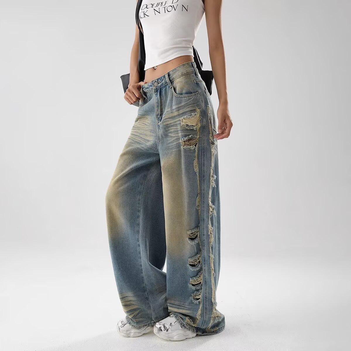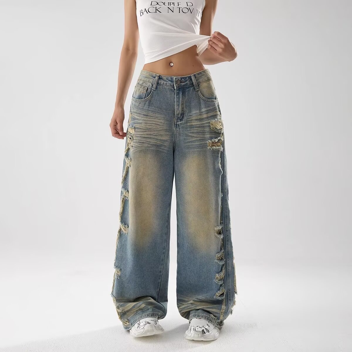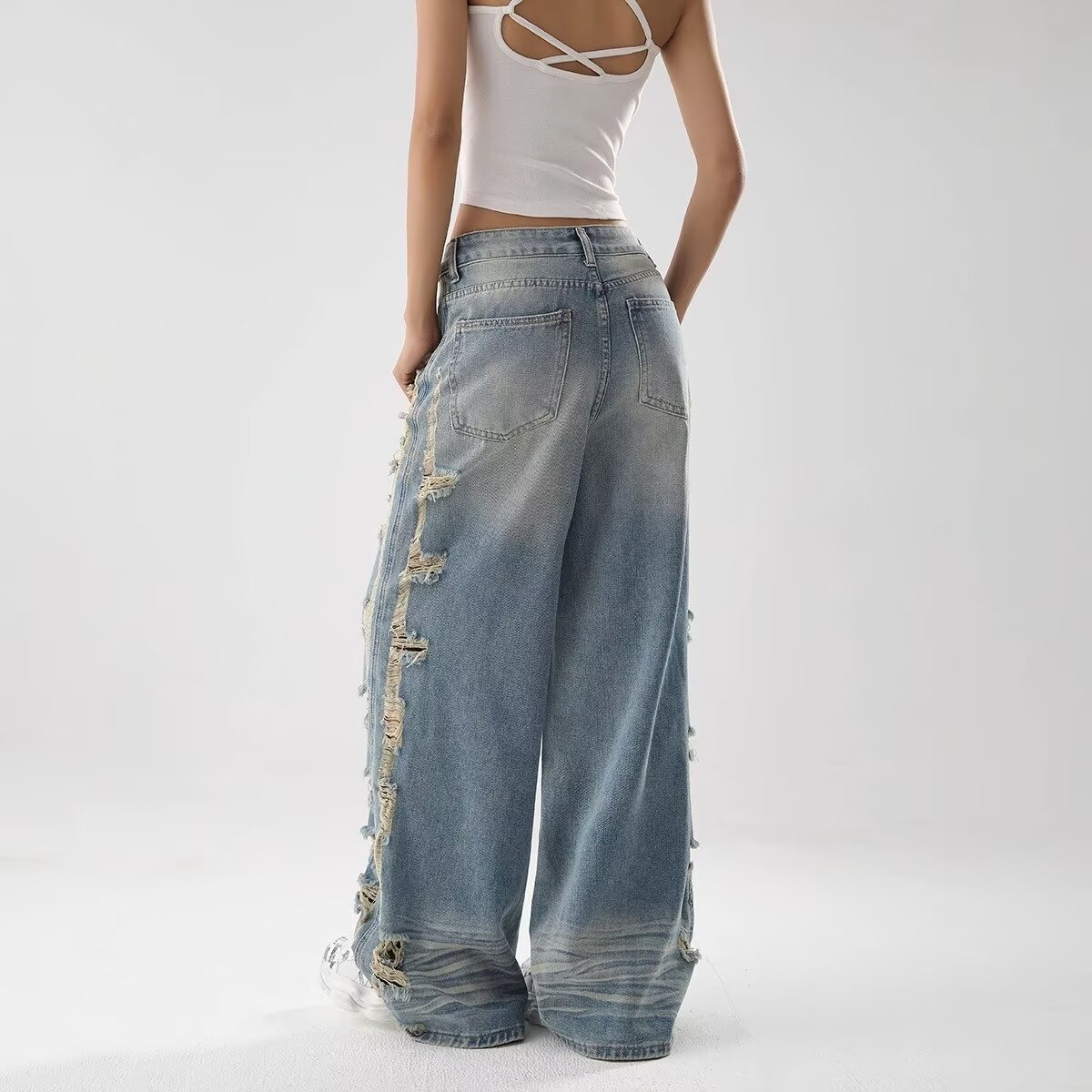 FA45049# 美式高街复古蓝破洞阔腿牛仔裤女秋季新款宽松直筒垂感裤子 服裝批發女裝批發服飾貨源