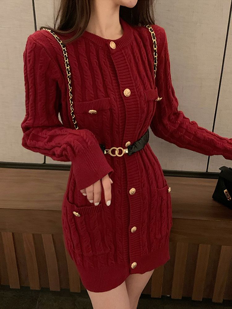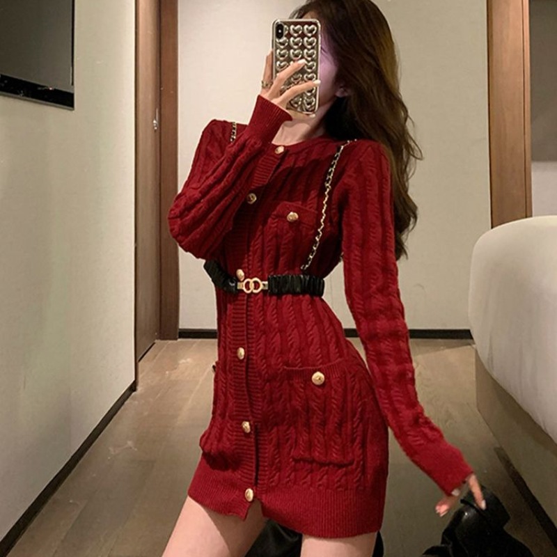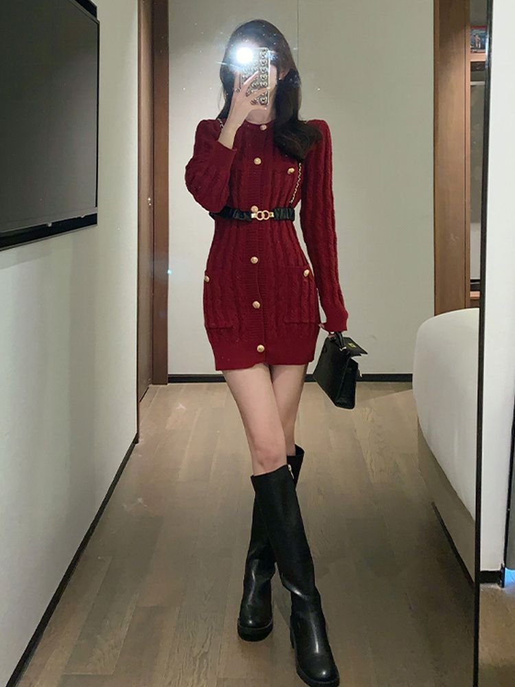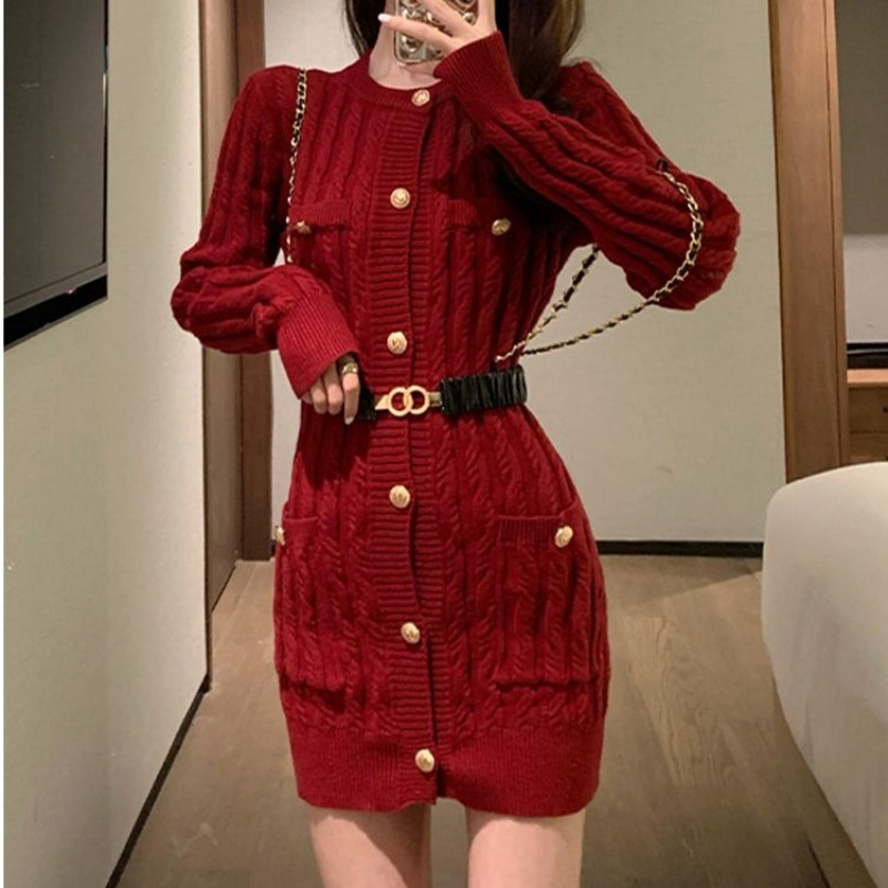 FA45123# 红色连体毛衣女秋季小香风长袖气质收腰修身麻花中长款针织连衣裙 服裝批發女裝批發服飾貨源