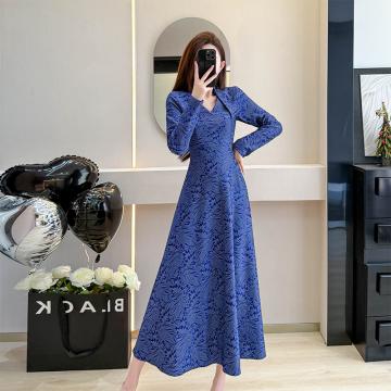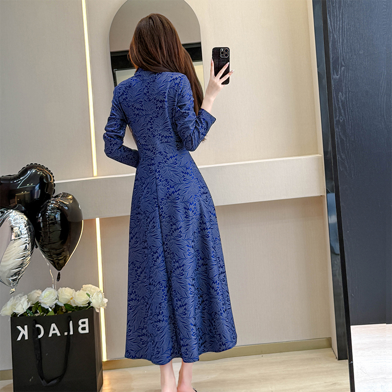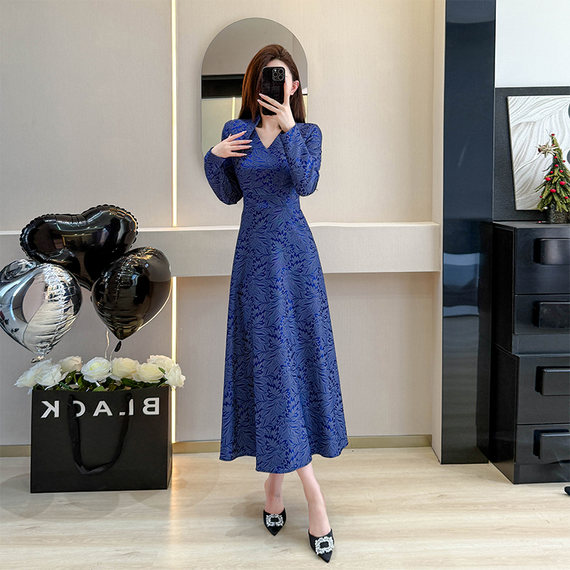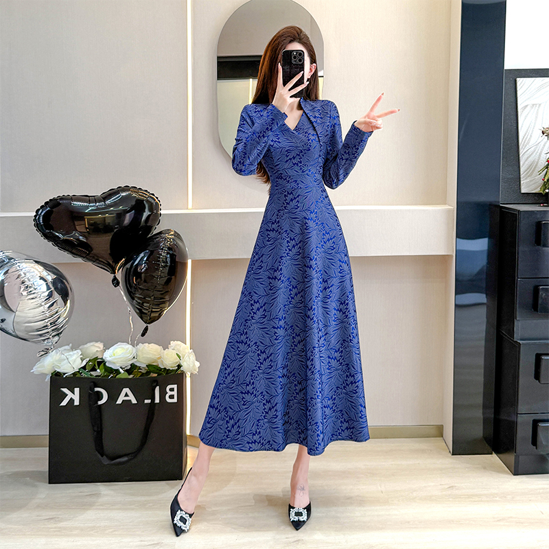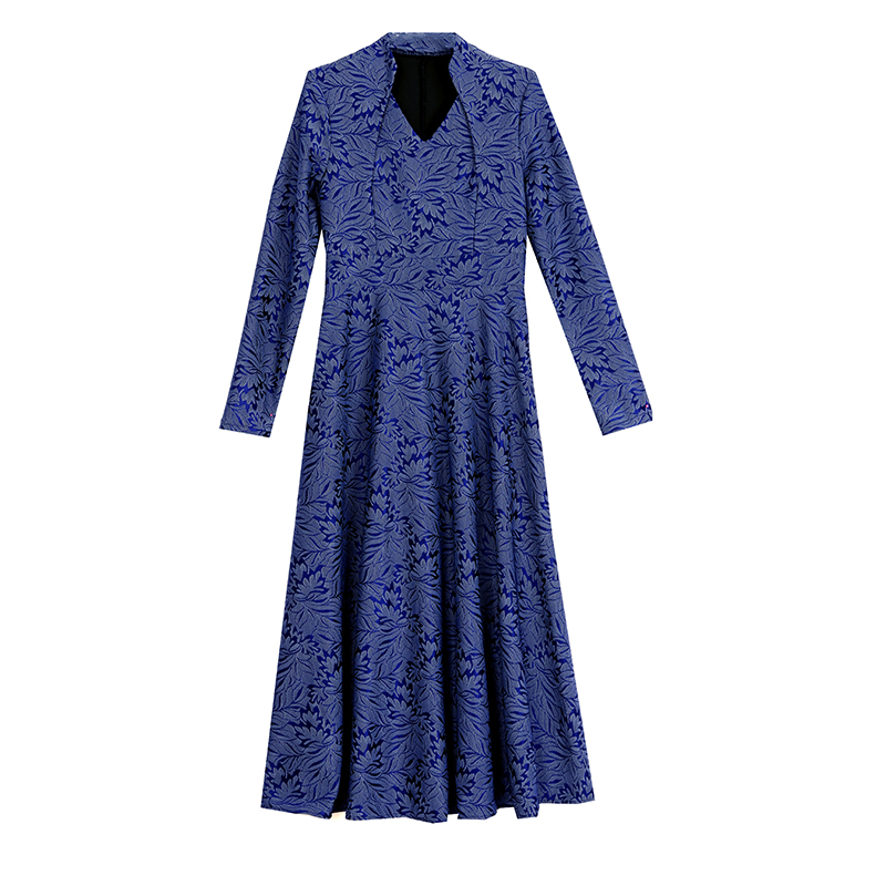 FA45127# 蓝色连衣裙秋装新款高级感气质显瘦裙子女春秋提花长款连身裙 服裝批發女裝批發服飾貨源