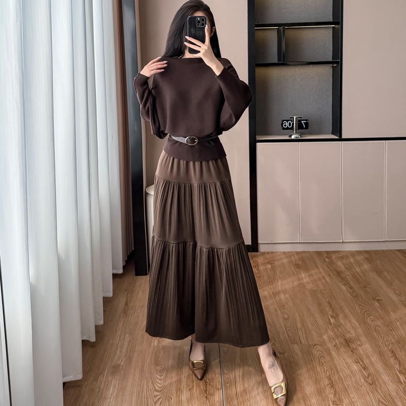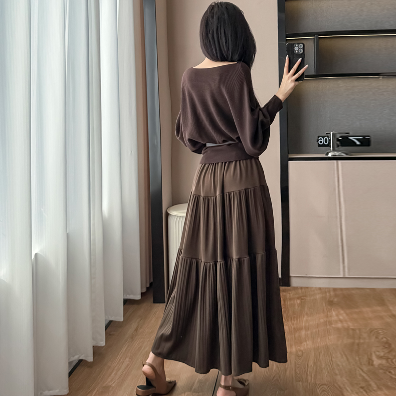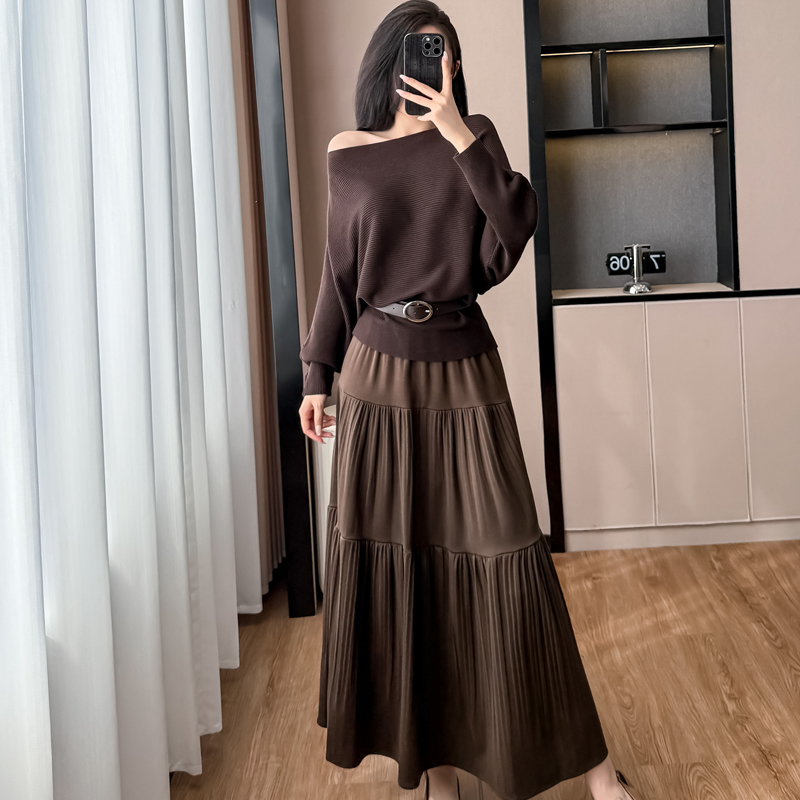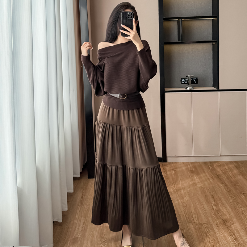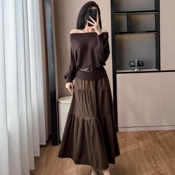 FA45133# 法式气质名媛风高级感一字领露肩针织上衣压褶半身长裙两件套女 服裝批發女裝批發服飾貨源
