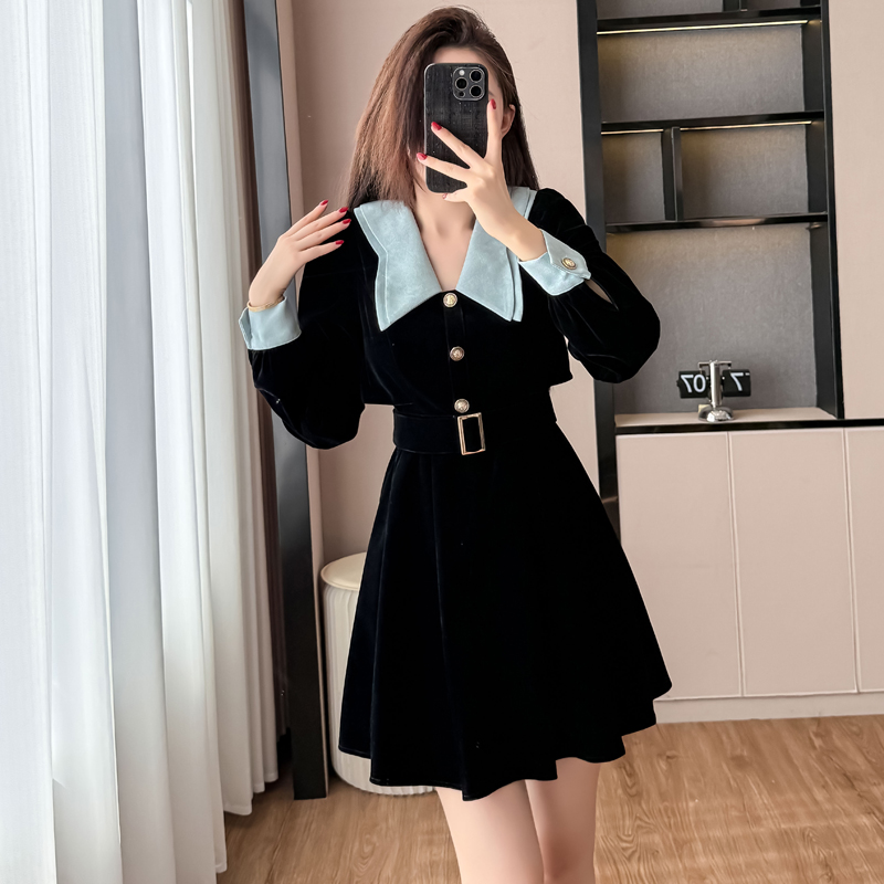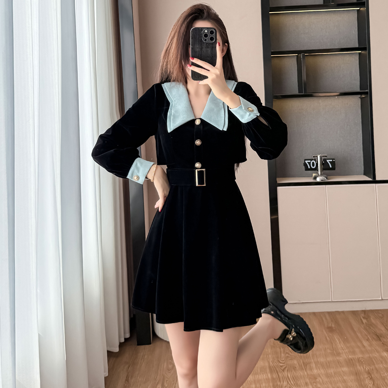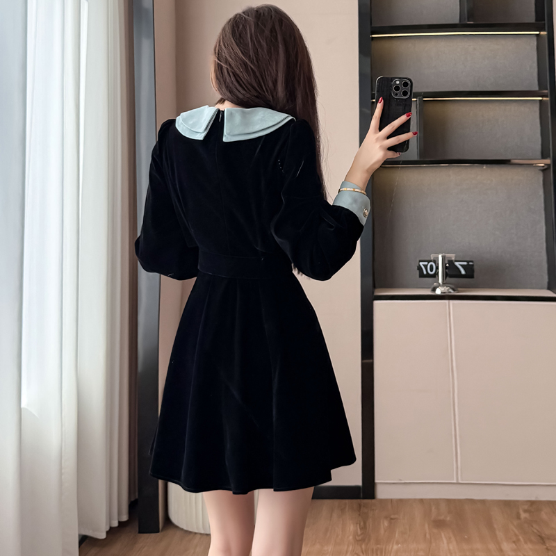 FA45136# 法式娃娃领黑色丝绒连衣裙女爆款秋季赫本千金风气质生日裙小礼裙 服裝批發女裝批發服飾貨源