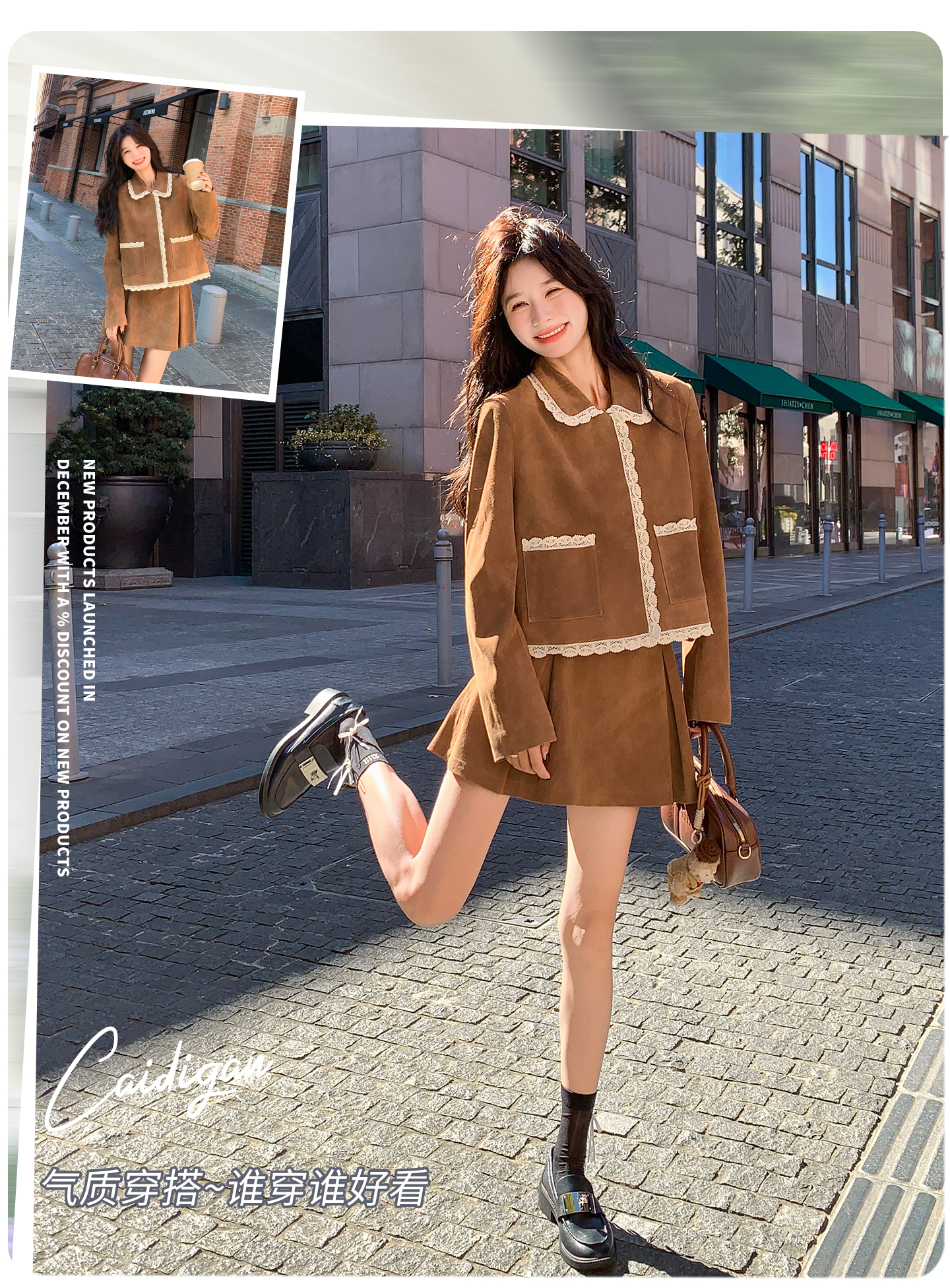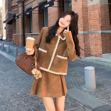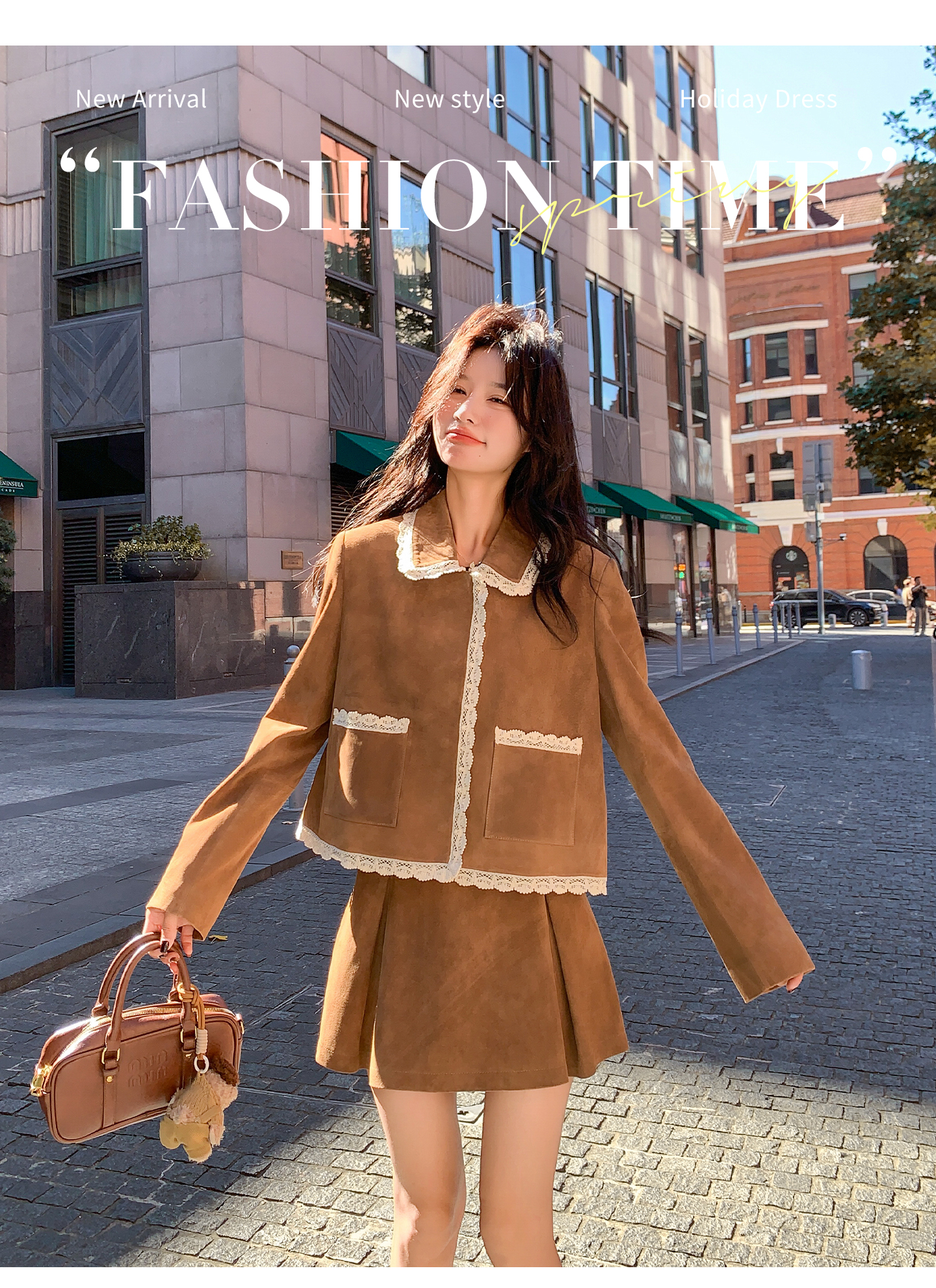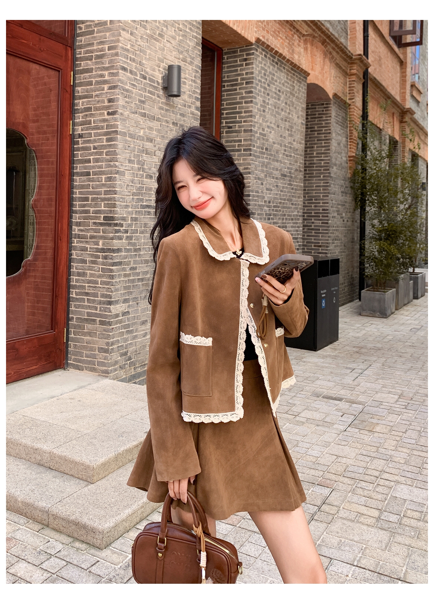 FA45139# 甜美少女风咖色小个子复古气质女秋新款撞色花边翻领外套 服裝批發女裝批發服飾貨源