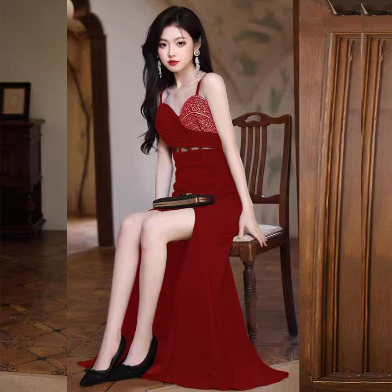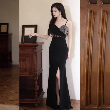 FA45190# 性感黑色吊带晚礼服修身高开叉气质连衣裙名媛宴会闪钻高端长款裙 服裝批發女裝批發服飾貨源