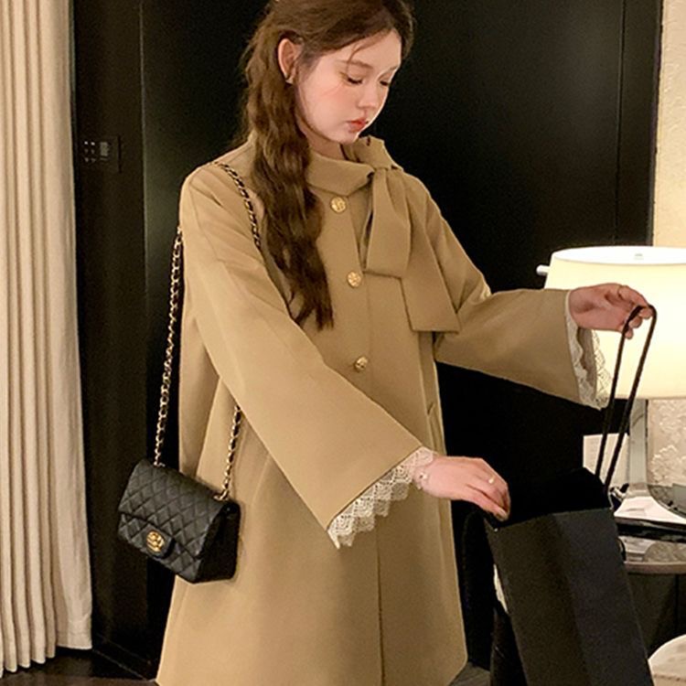 FA45755# 英伦风千金蝴蝶结立领风衣外套女装秋季新款小个子中长卡其色大衣 服裝批發女裝批發服飾貨源