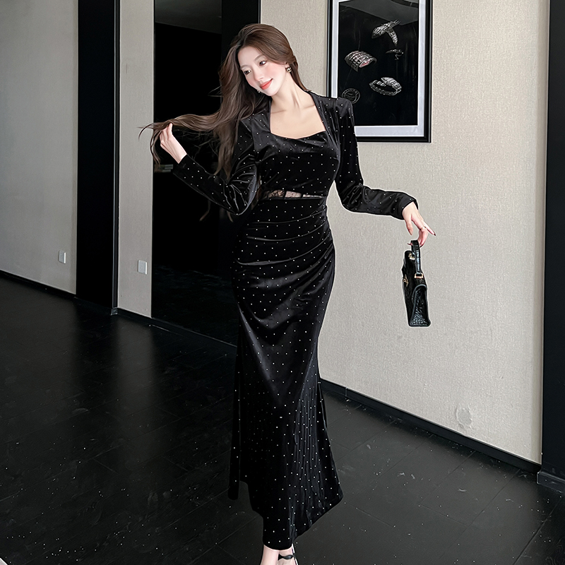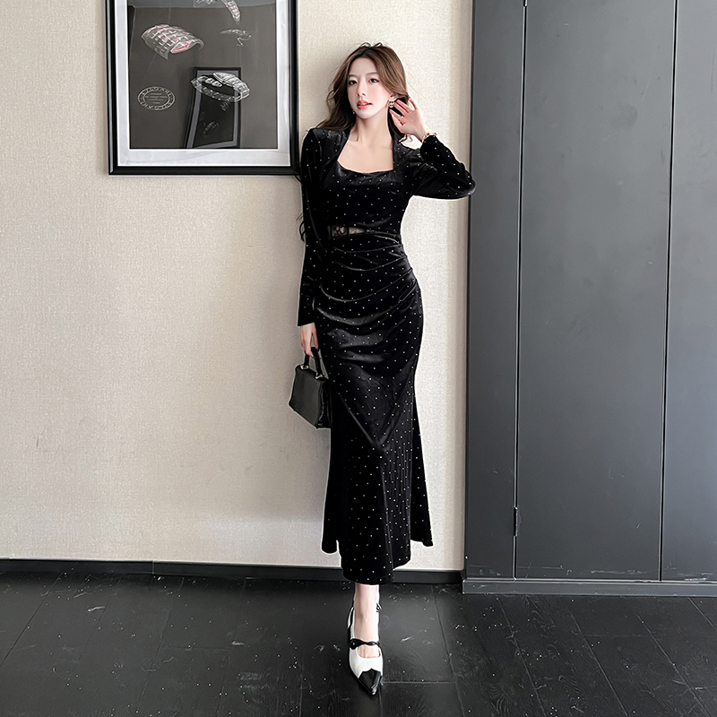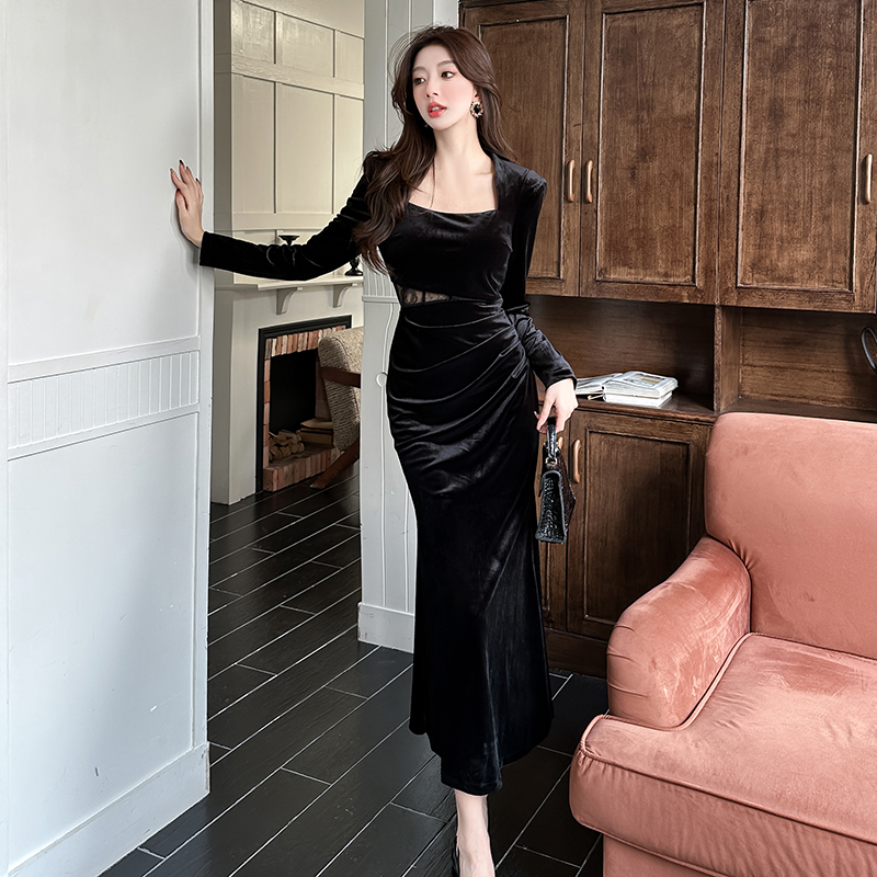 FA45969# 法式方领设计蕾丝镂空收腰小心机秋冬轻奢时尚连衣裙 服裝批發女裝批發服飾貨源