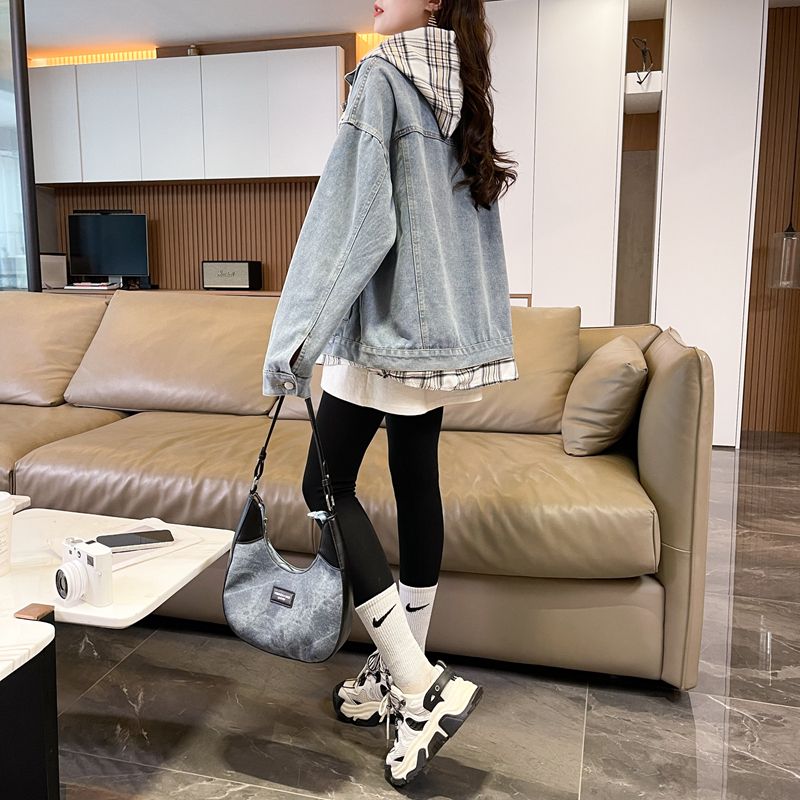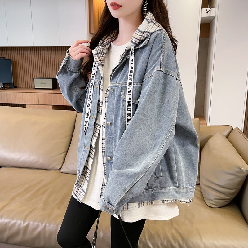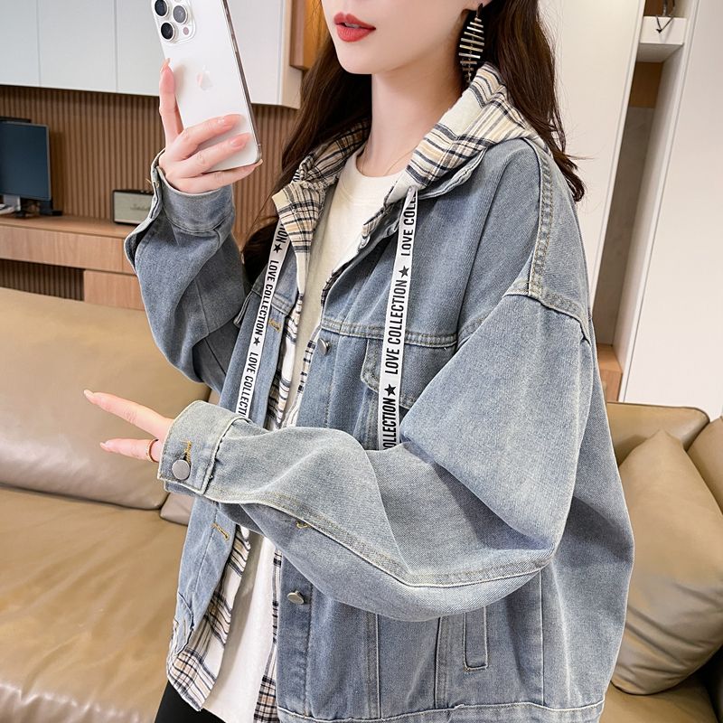 FA46161# 牛仔布春秋新款慵懒风设计感假两件连帽牛仔外套 服裝批發女裝批發服飾貨源