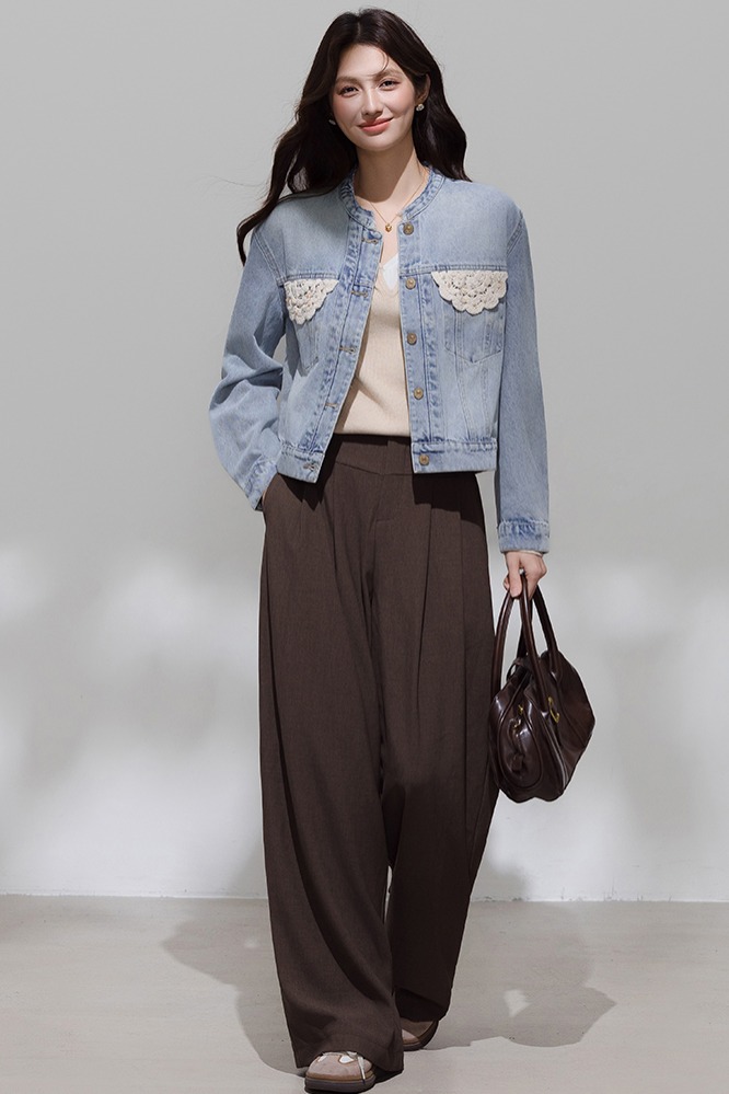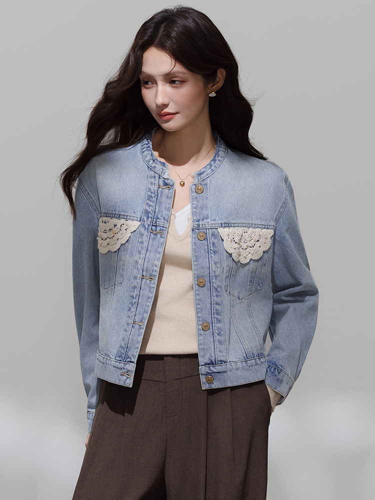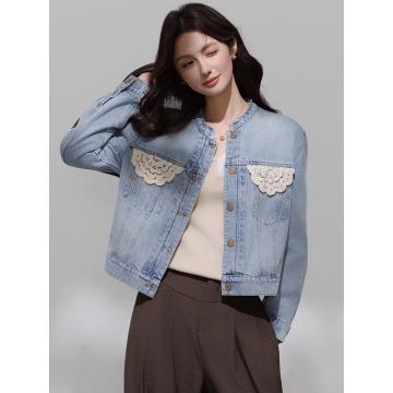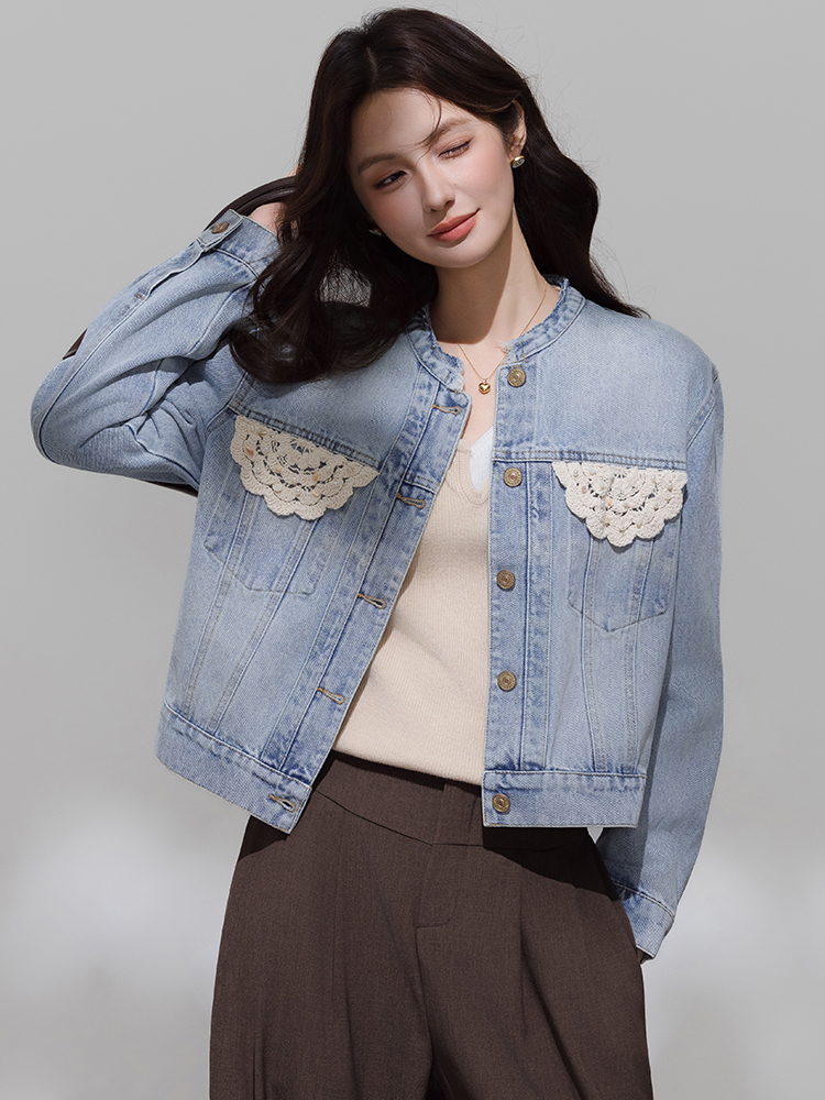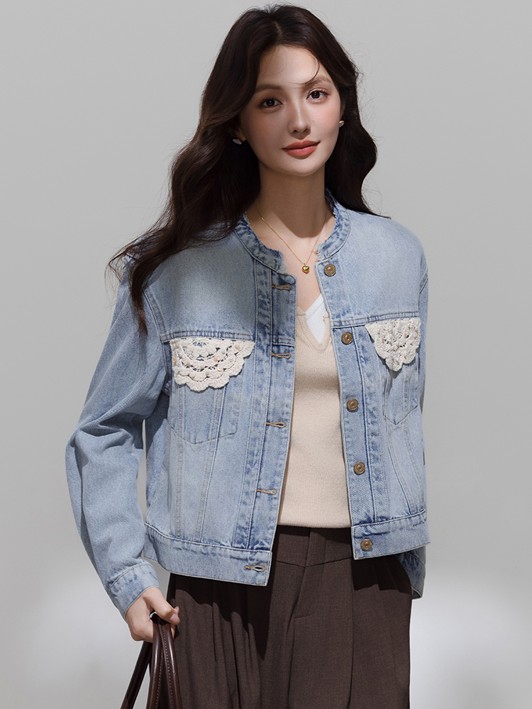 FA46184# 春秋季新款港风复古花边短款牛仔外套女洋气修身显瘦休闲夹克 服裝批發女裝批發服飾貨源