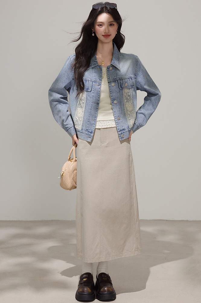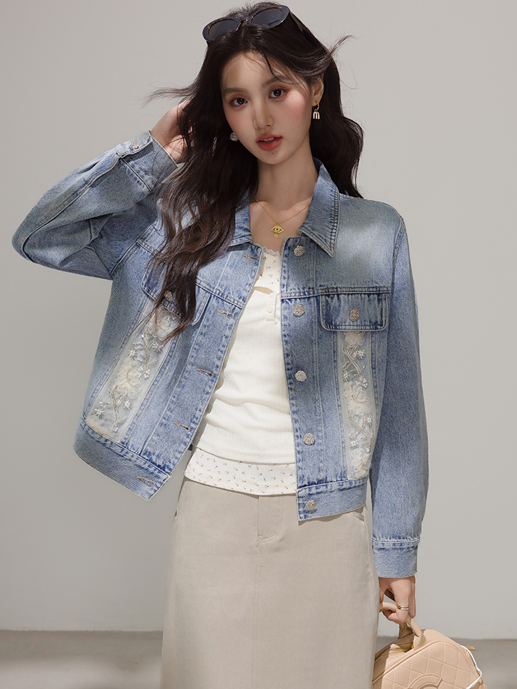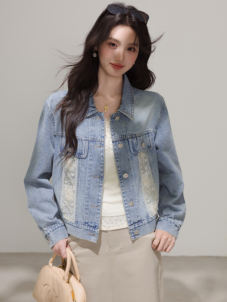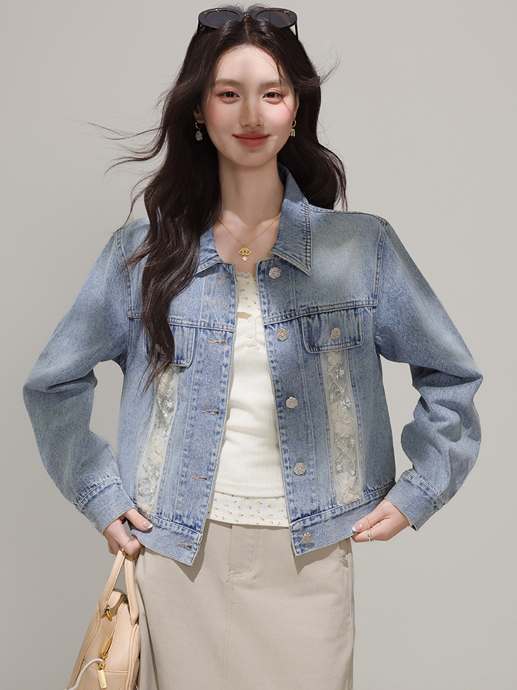 FA46186# 小香风牛仔外套女春秋款新款韩版宽松蕾丝拼接夹克潮 服裝批發女裝批發服飾貨源