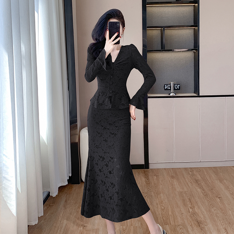 FA46196# V领喇叭袖时尚上衣鱼尾半身裙时髦两件套套装 服裝批發女裝批發服飾貨源
