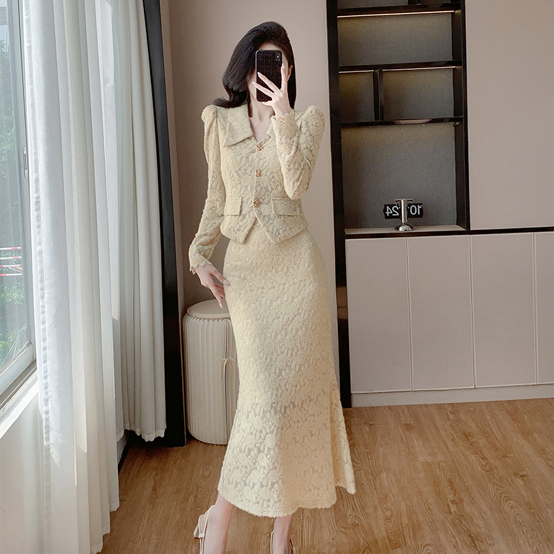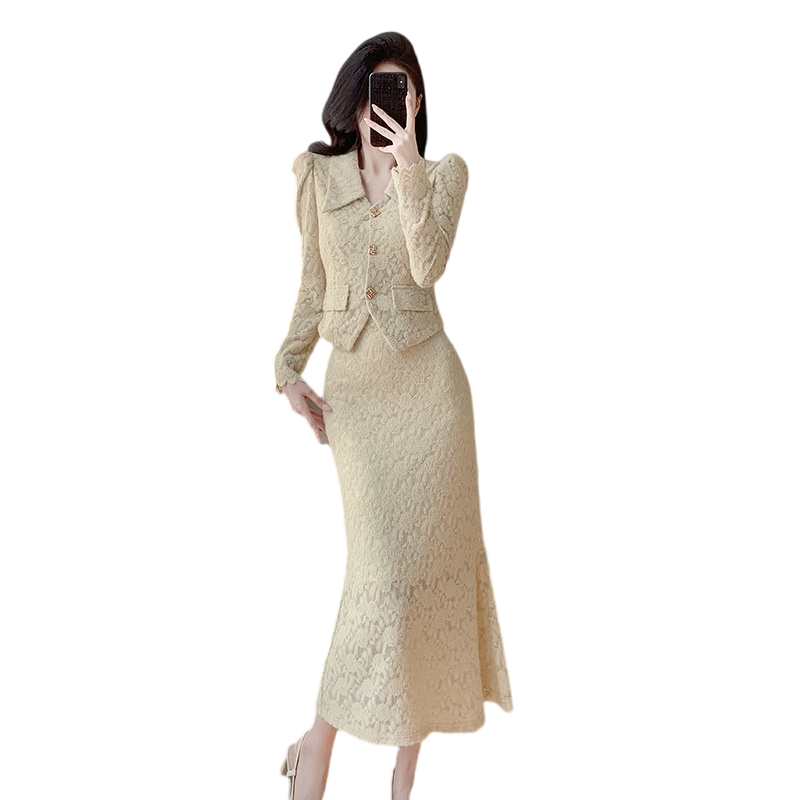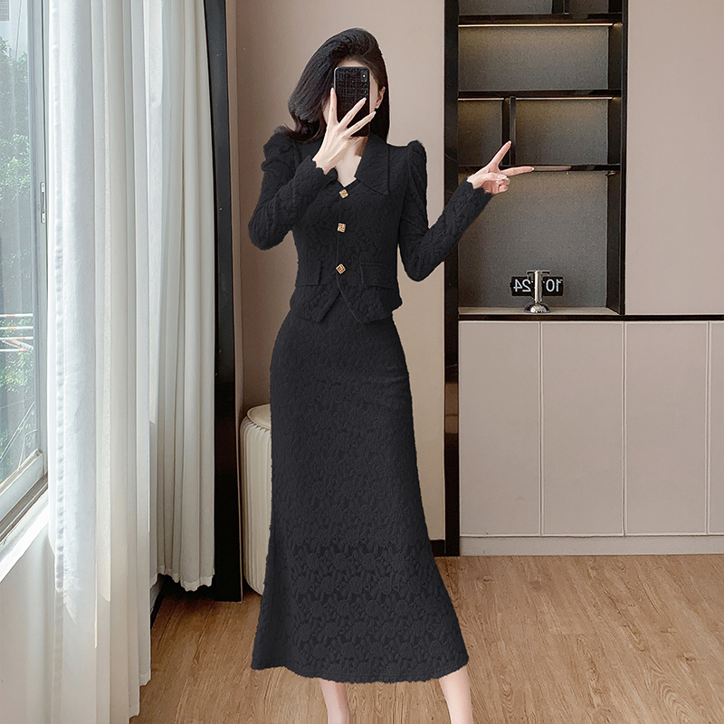 FA46201# 秋款气质时尚连衣裙蕾丝小香风上衣半身裙两件套 服裝批發女裝批發服飾貨源