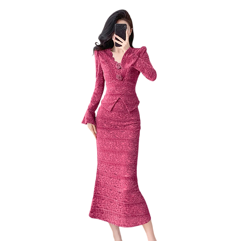 FA46202# 提花蕾丝上衣高腰半身裙两件套时尚洋气套装 服裝批發女裝批發服飾貨源