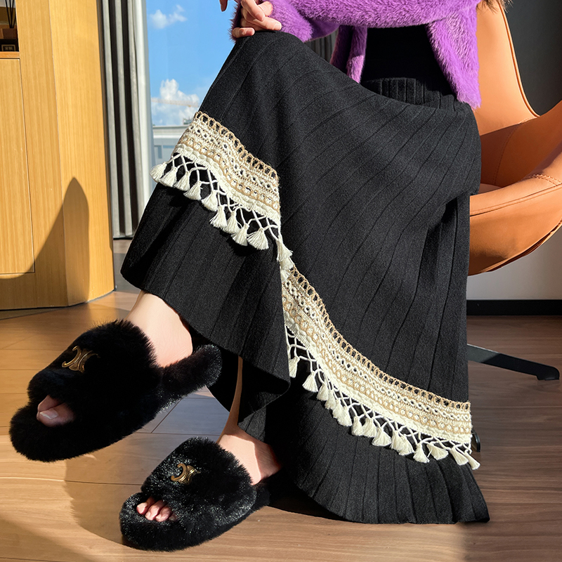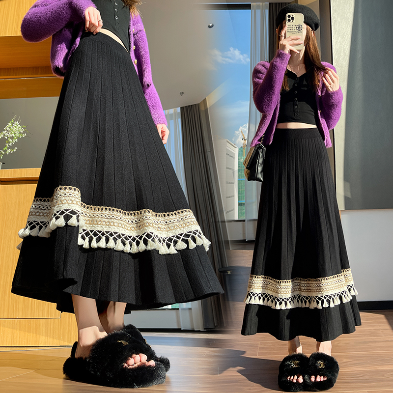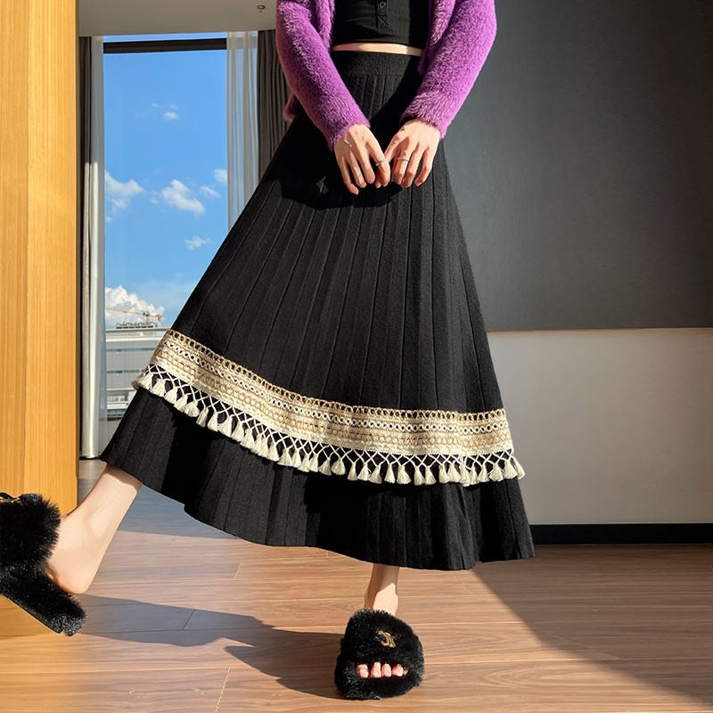 FA46387# 百褶流苏拼接针织半身裙女秋冬软糯高腰A字大摆毛线裙 服裝批發女裝批發服飾貨源