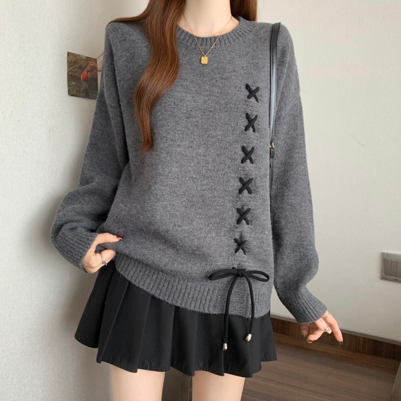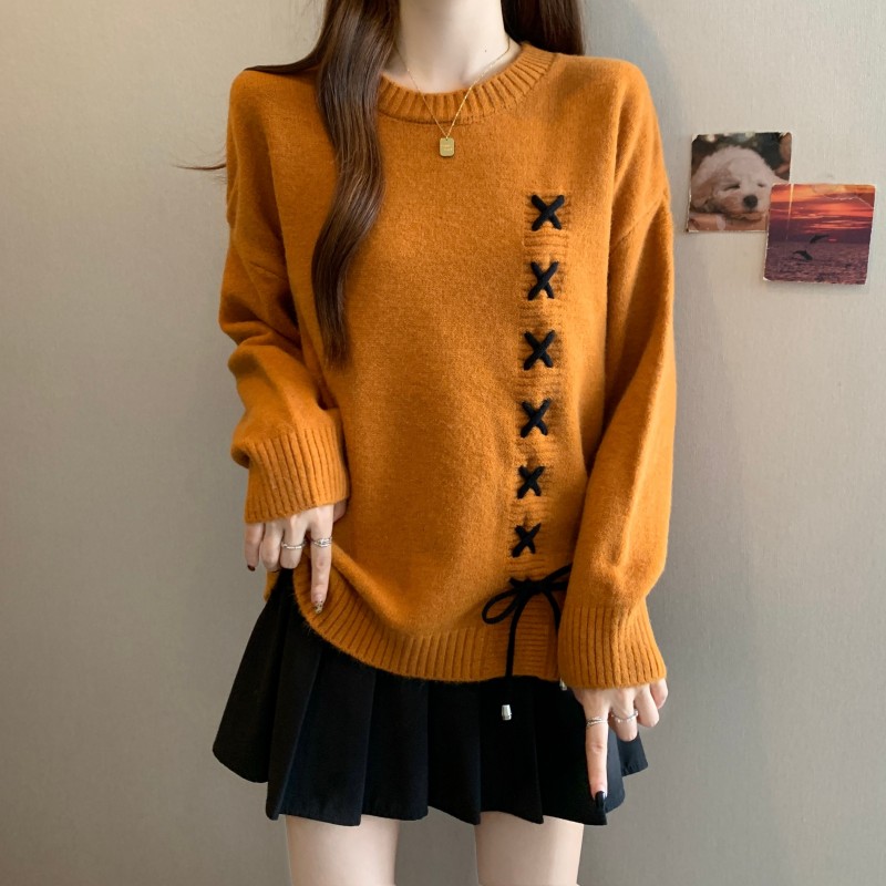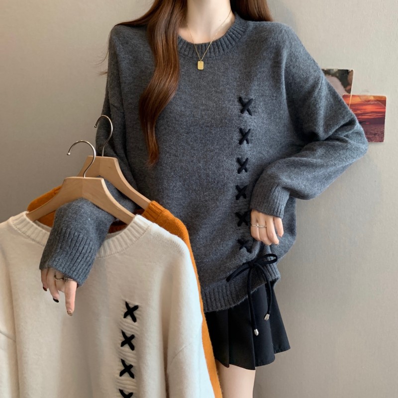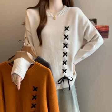 Home > 毛衣、针织衫 > FA46879# 大码胖MM秋冬新款圆领落肩袖交叉系绳长袖套头上衣毛衣 服裝批發女裝批發服飾貨源