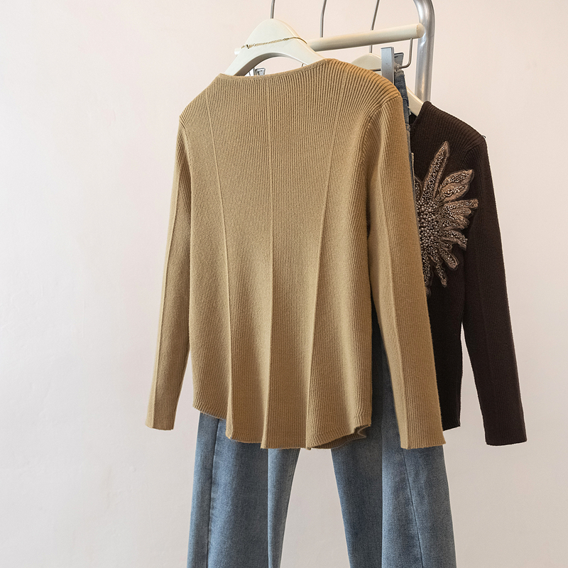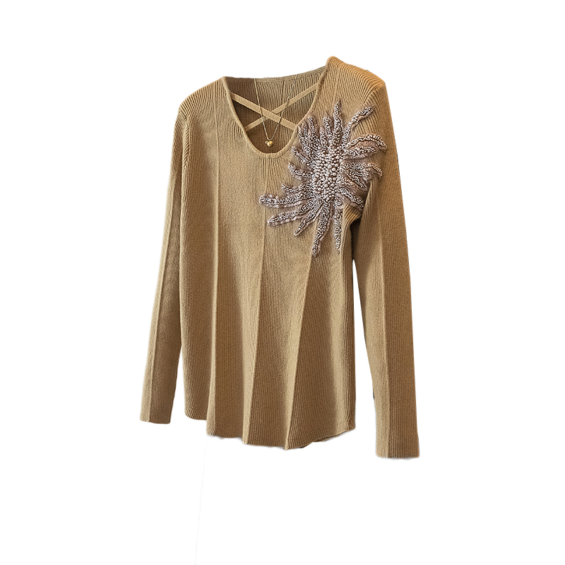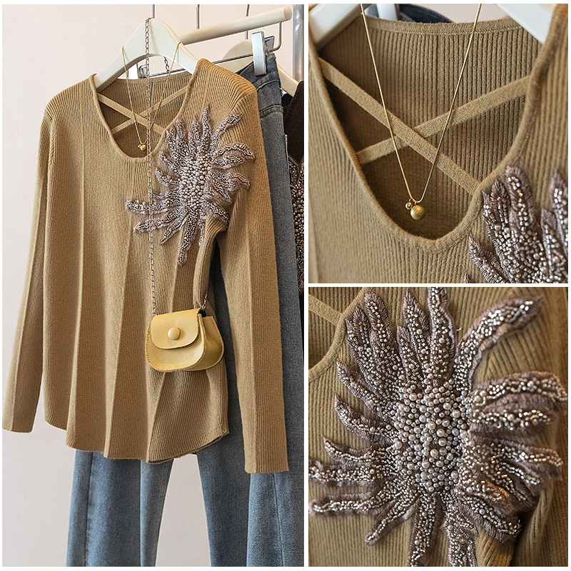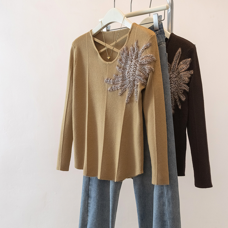 FA46981# 胖mm法式交叉领立体花朵针织衫新款设计感重工钉珠气质上衣 服裝批發女裝批發服飾貨源
