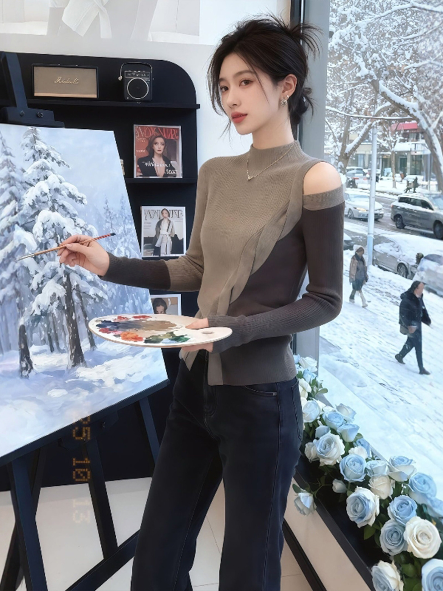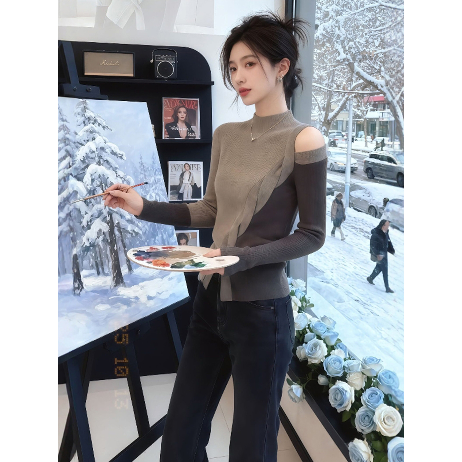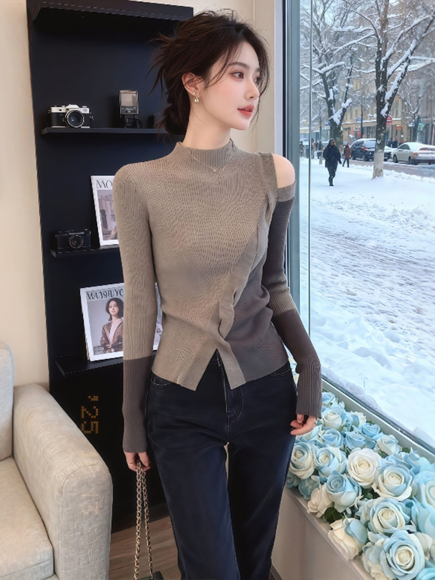 FA47017# 卡其色半高领不规则露肩长袖t恤女早秋轻熟小众不撞款上衣 服裝批發女裝批發服飾貨源