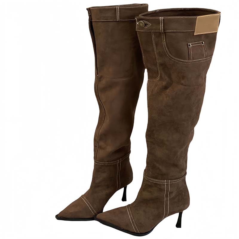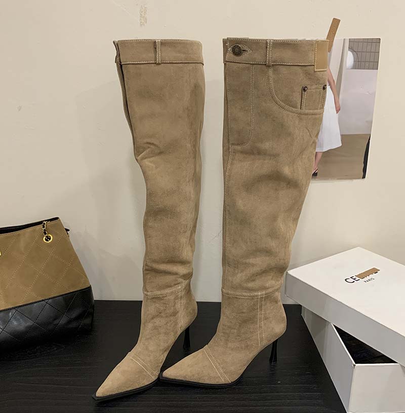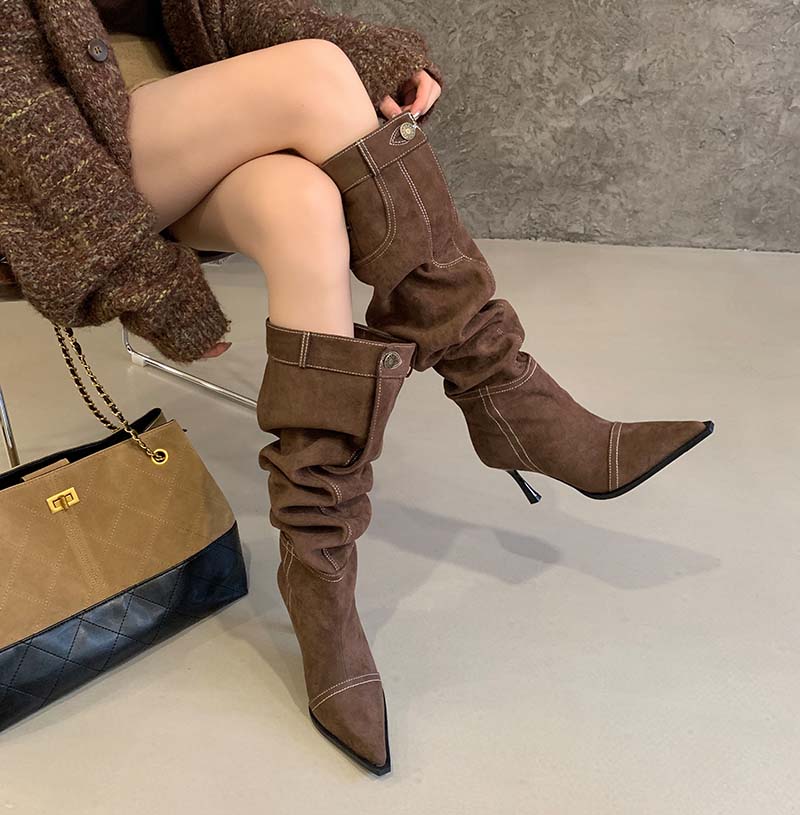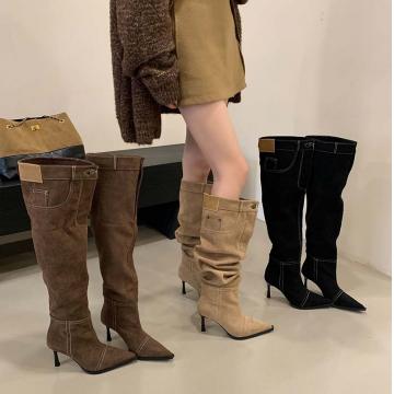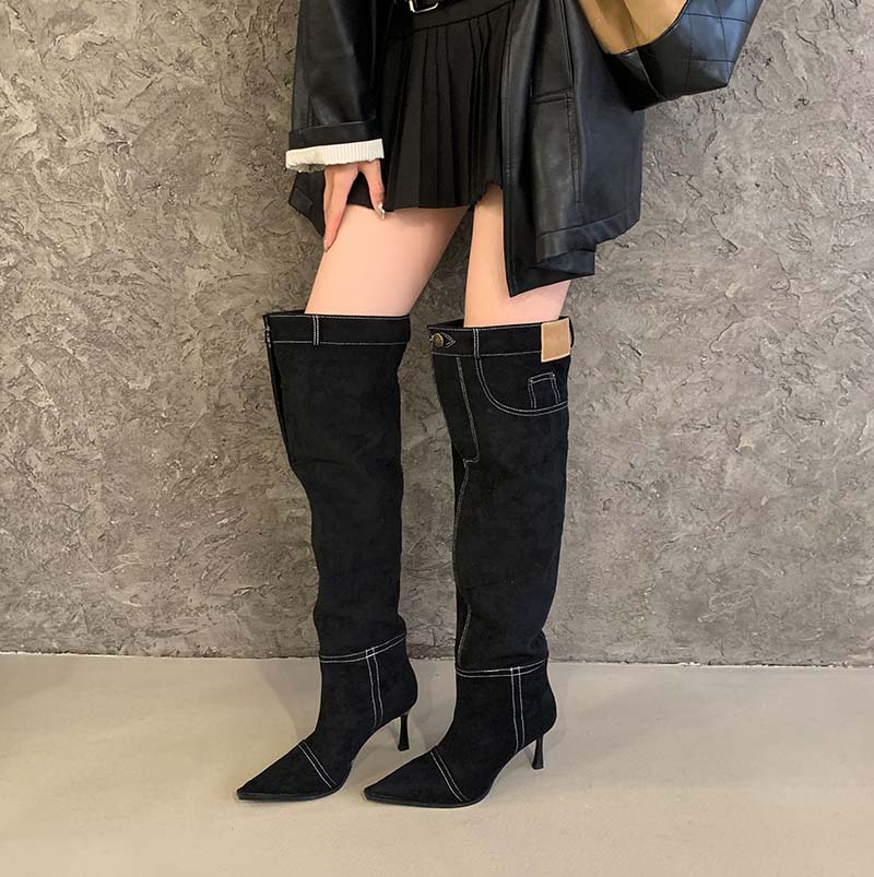 X-32867# 高跟辣妹风尖头牛仔靴女鞋秋冬新款堆堆靴细跟复古法式单靴 鞋子批发女鞋批发货源