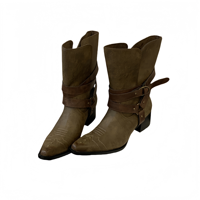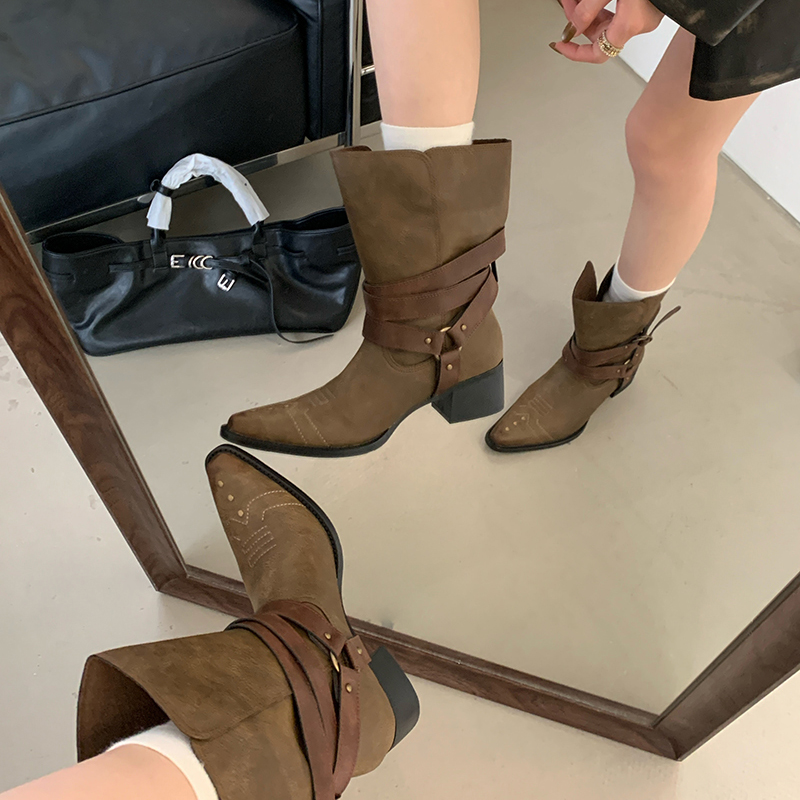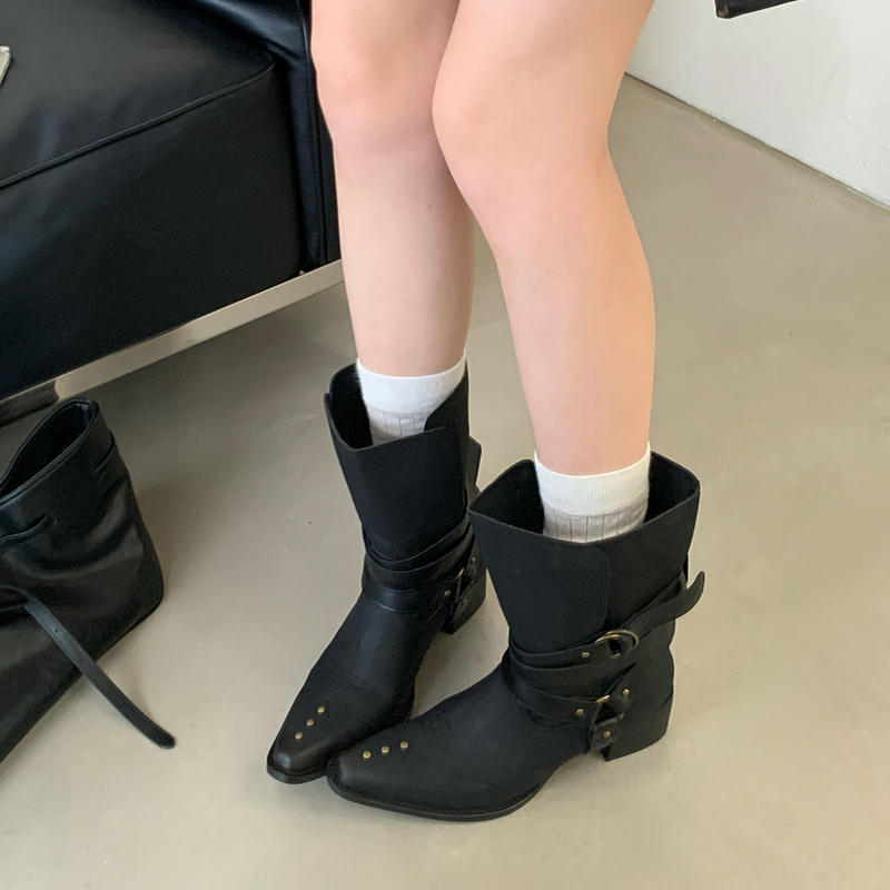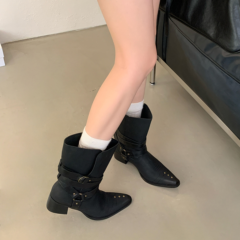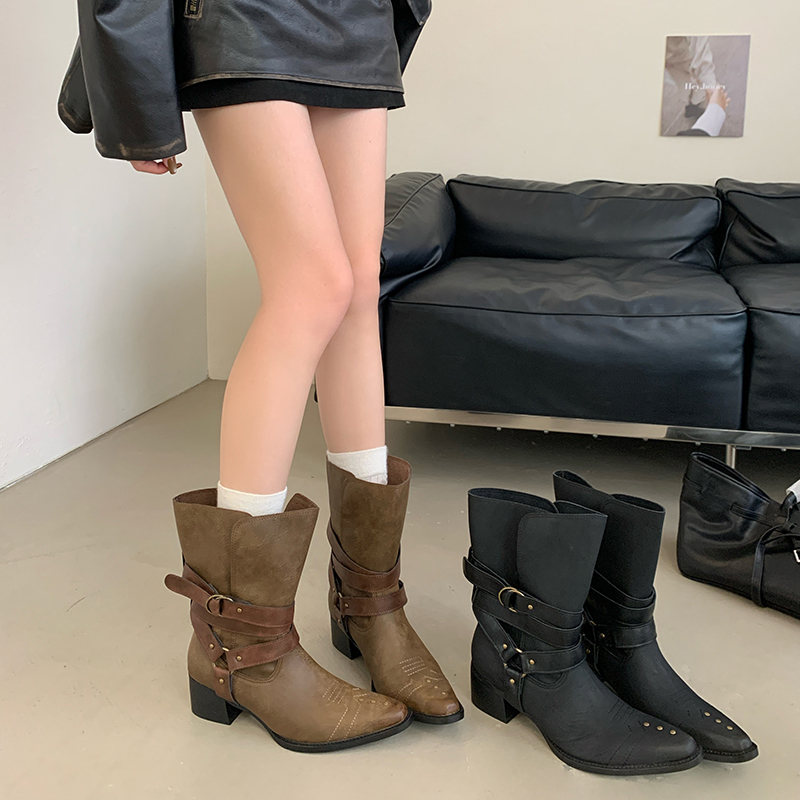X-32877# 复古小众皮带扣短靴尖头套筒舒适粗跟靴子秋冬显瘦宽筒西部靴 鞋子批发女鞋批发货源