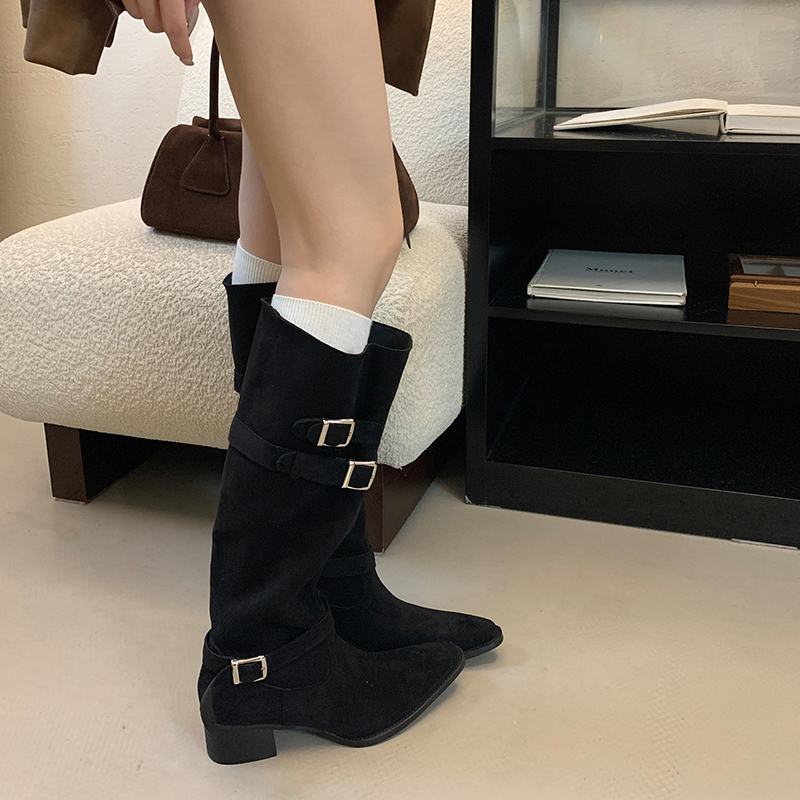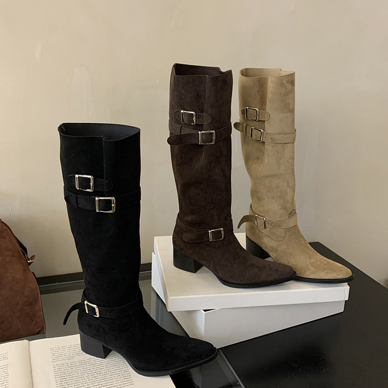 X-32879# 新款尖头皮带扣骑士靴舒适粗跟套筒高筒靴时尚百搭宽筒靴子女 鞋子批发女鞋批发货源