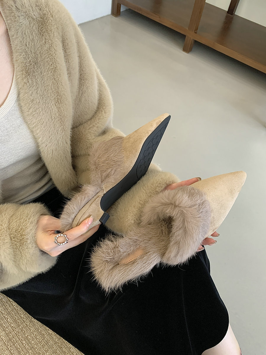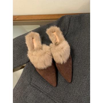 X-32885# 秋冬新款小猫跟尖头毛毛半拖鞋外穿包头真毛小矮跟穆勒包头拖 鞋子批发女鞋批发货源