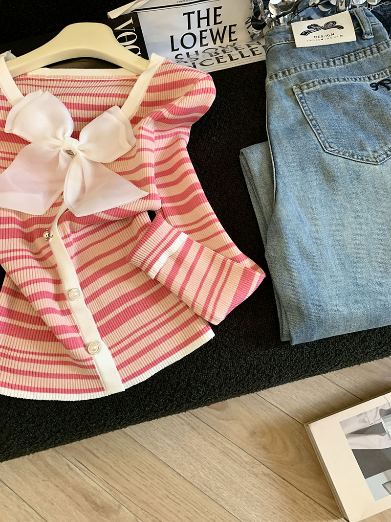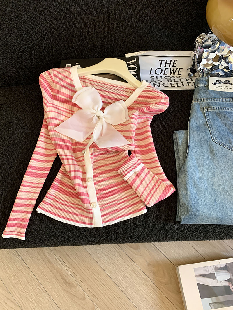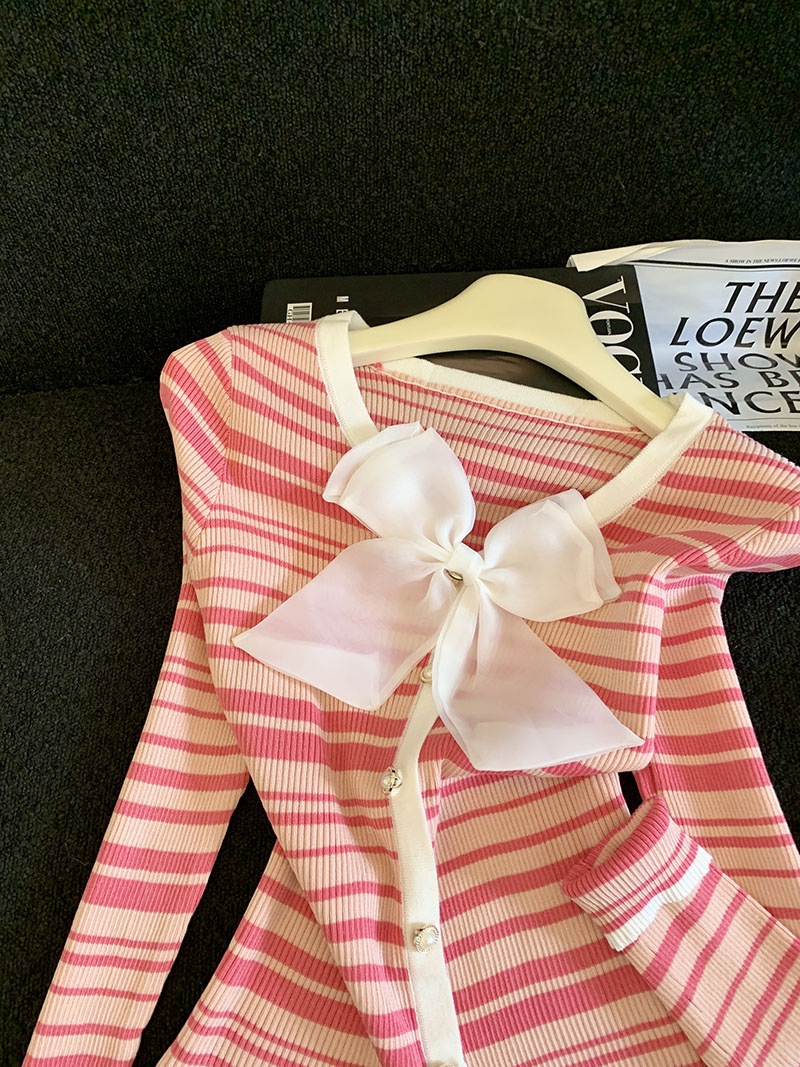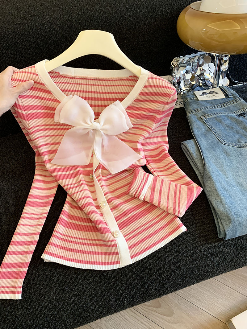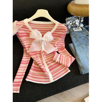 FA47120# 秋季法式蝴蝶结长袖针织上衣女装秋装新款条纹拼接开衫 服裝批發女裝批發服飾貨源