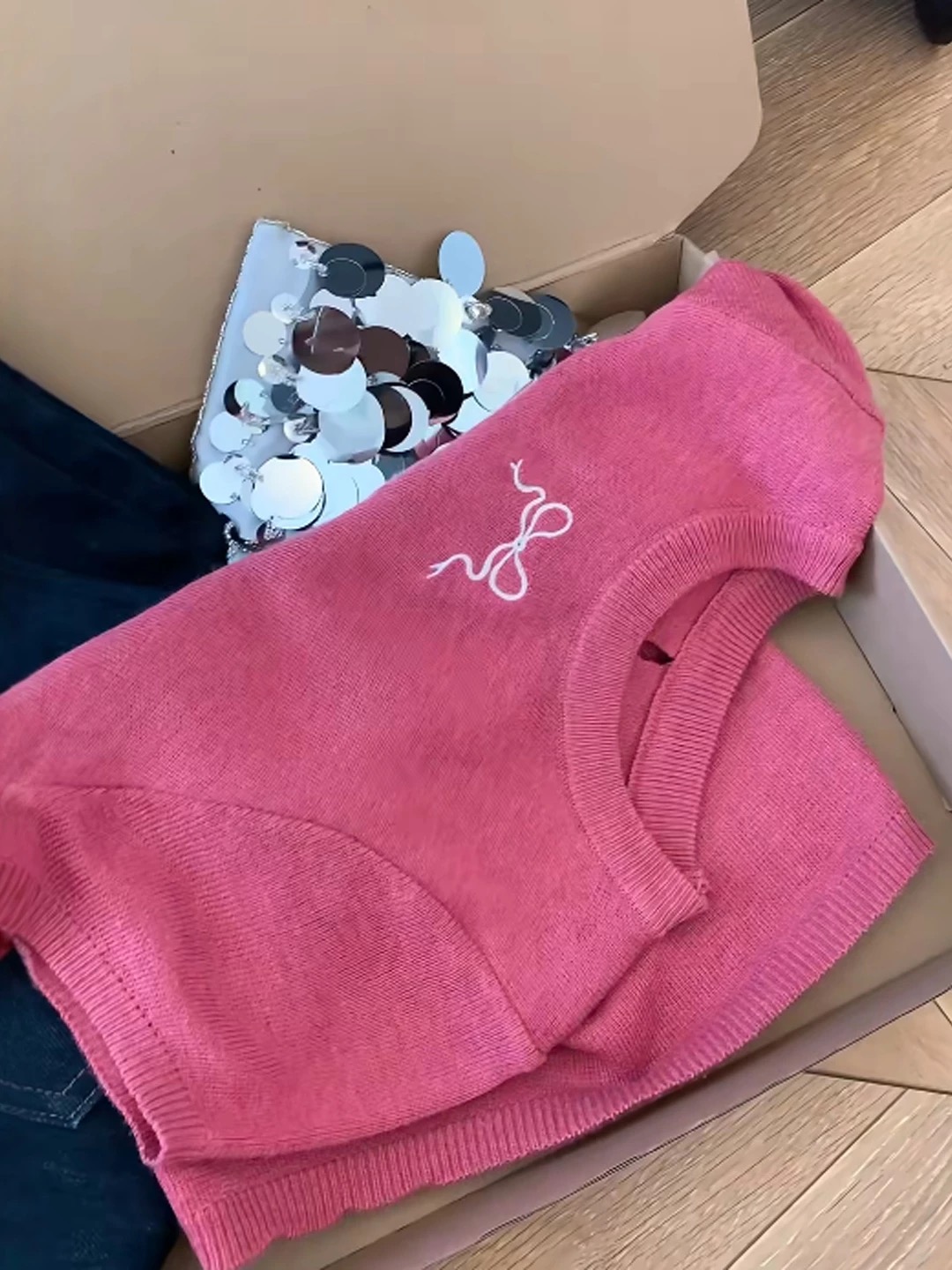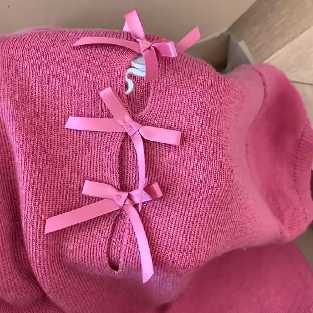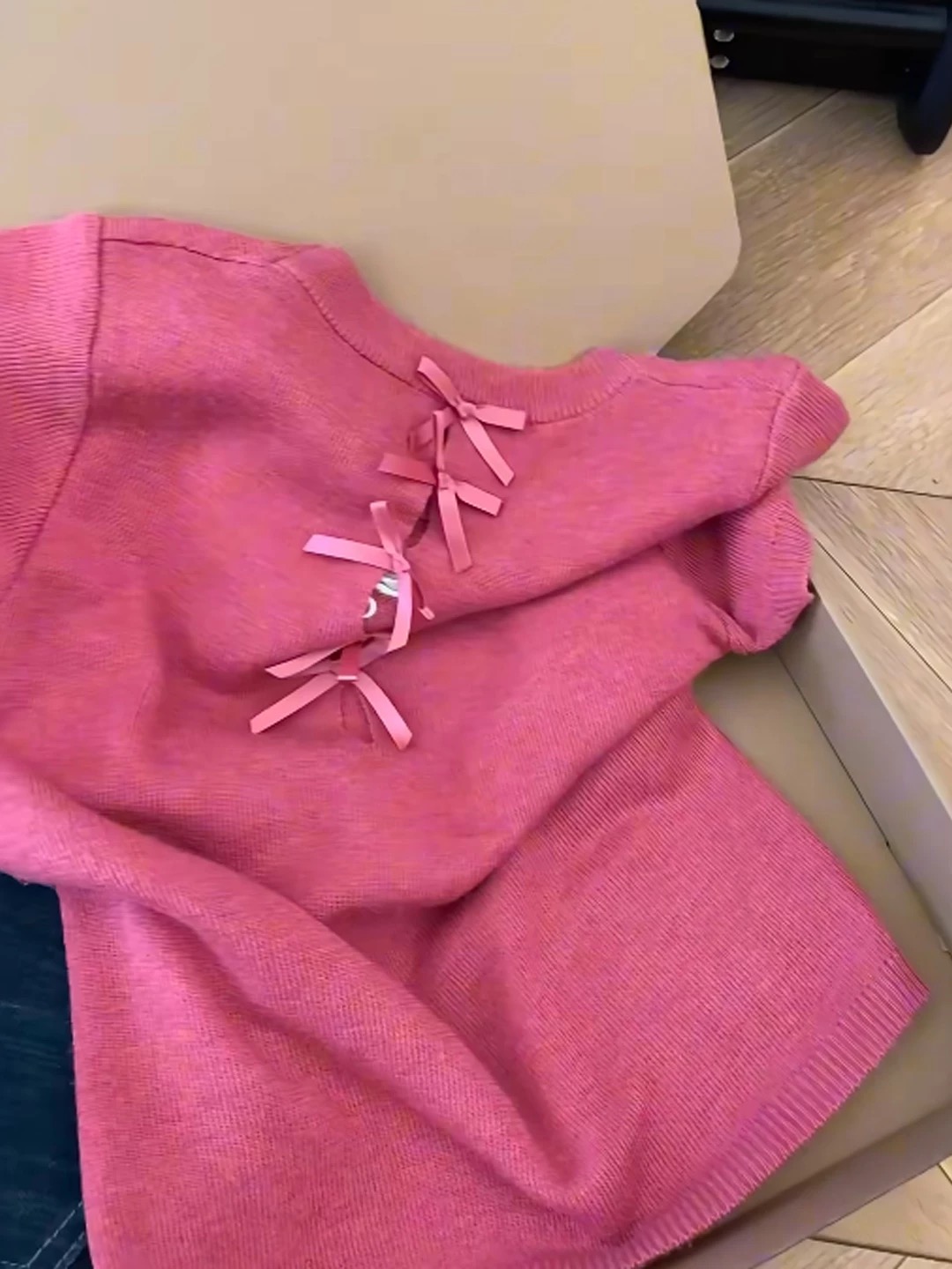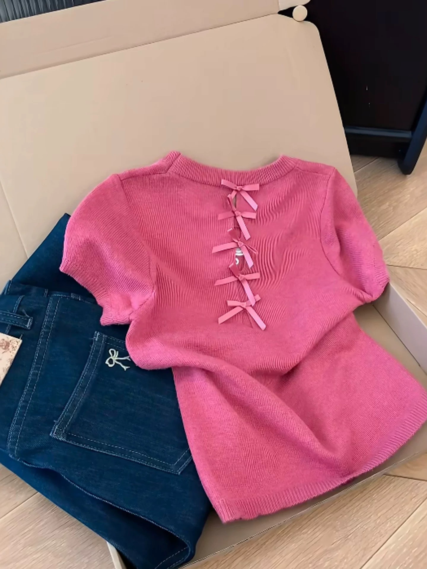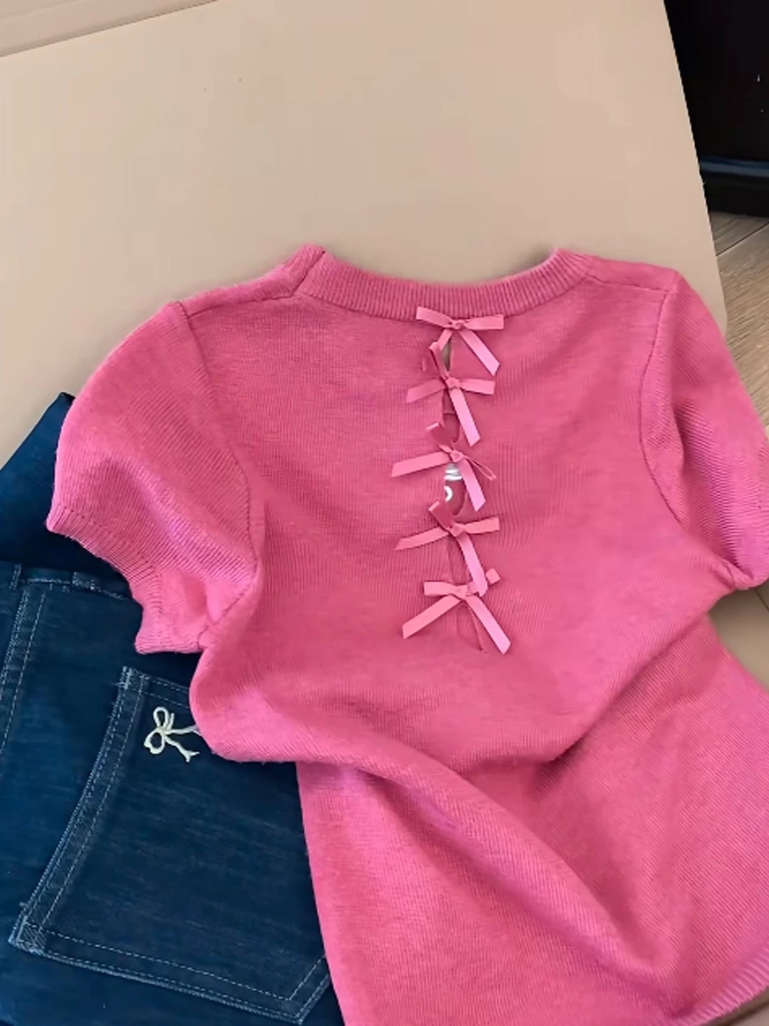 FA47166# 玫粉色蝴蝶结针织修身正肩短袖T恤女新款早秋季韩系穿搭上衣 服裝批發女裝批發服飾貨源