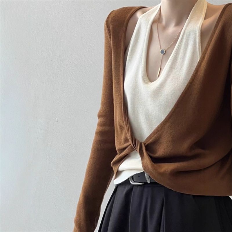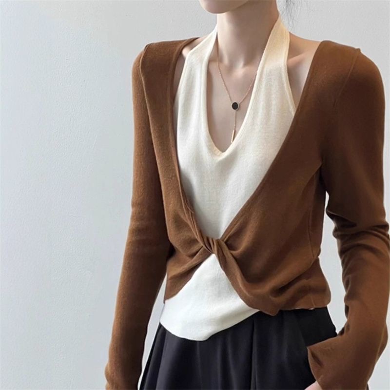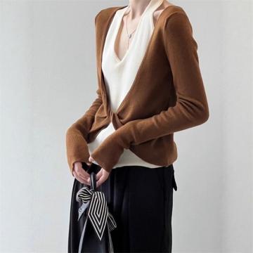 FA47260# 秋季新款流行独特别致设计轻奢显瘦百搭咖色V领假两件上衣ins 服裝批發女裝批發服飾貨源