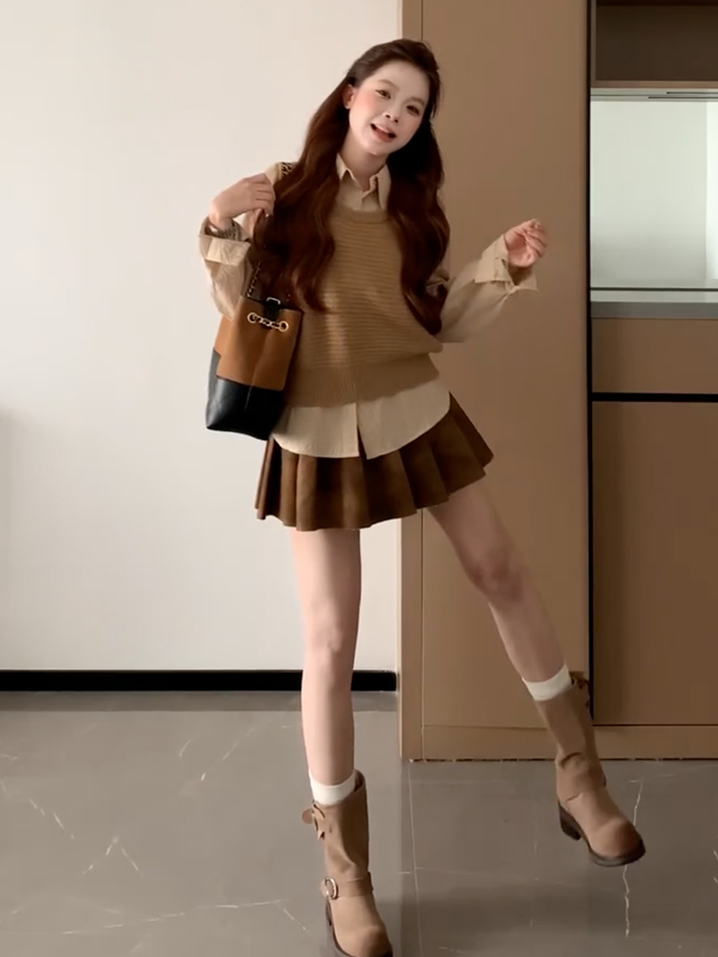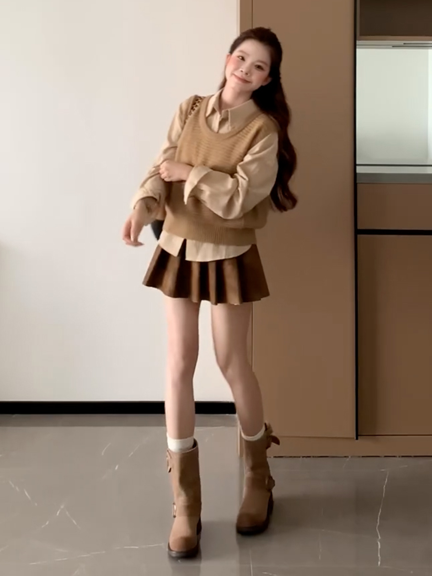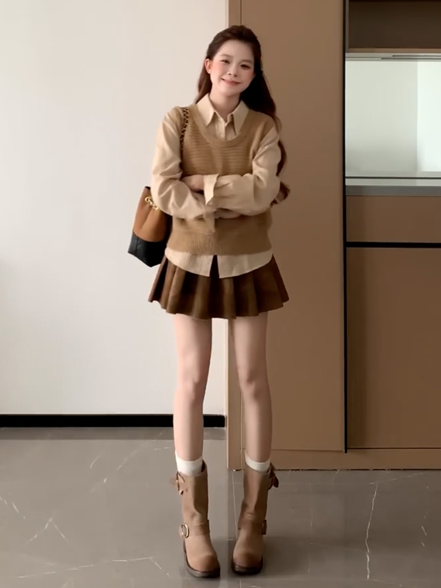 LN76371# 秋装搭配一整套姐系贵感套装女针织马甲叠穿长袖衬衫百褶裙三件套