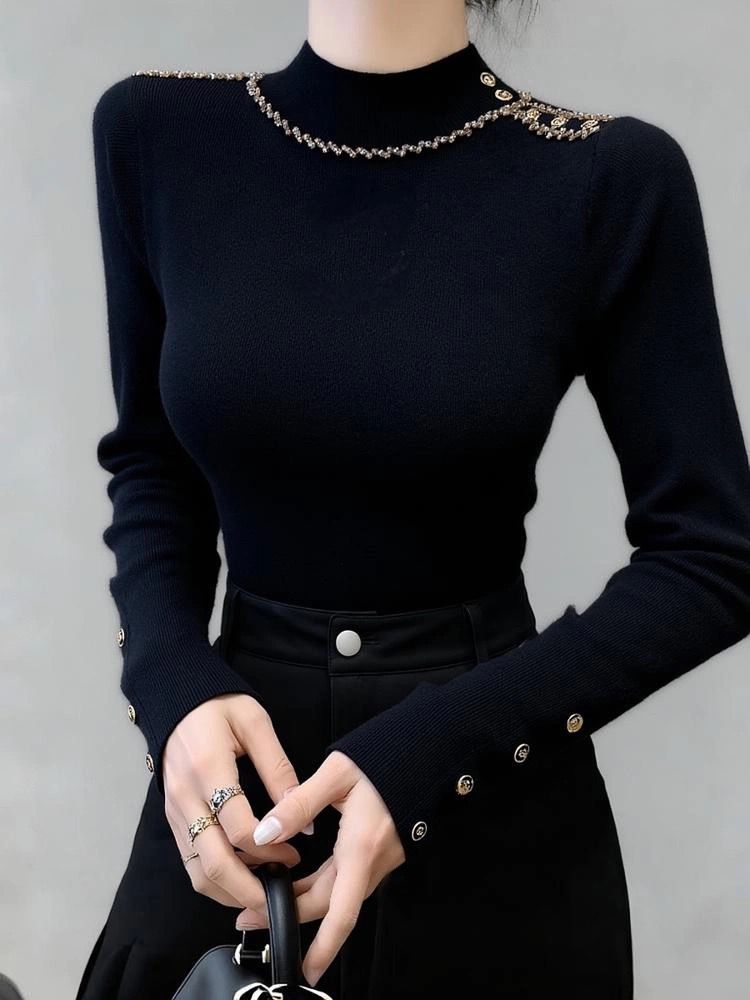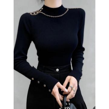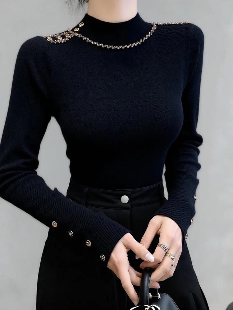 FA47341# 秋冬独特轻奢黑色正肩半高领针织打底衫女毛衣设计感法式上衣内搭 服裝批發女裝批發服飾貨源