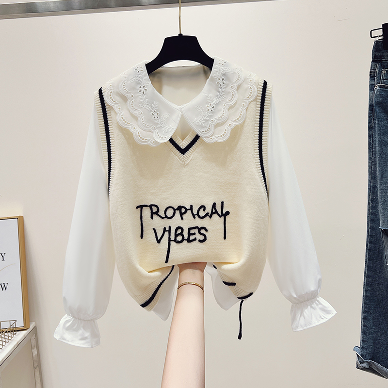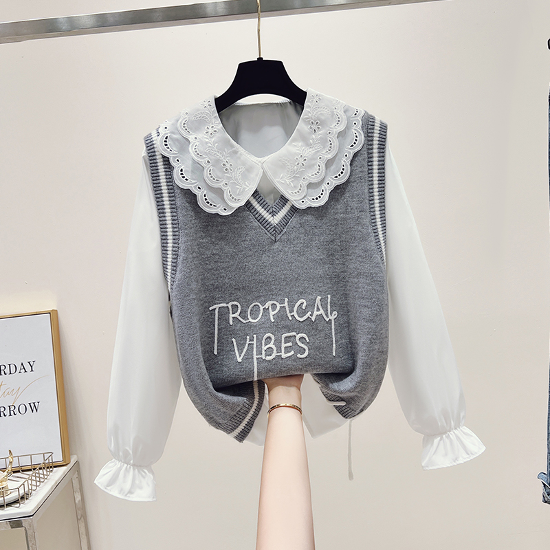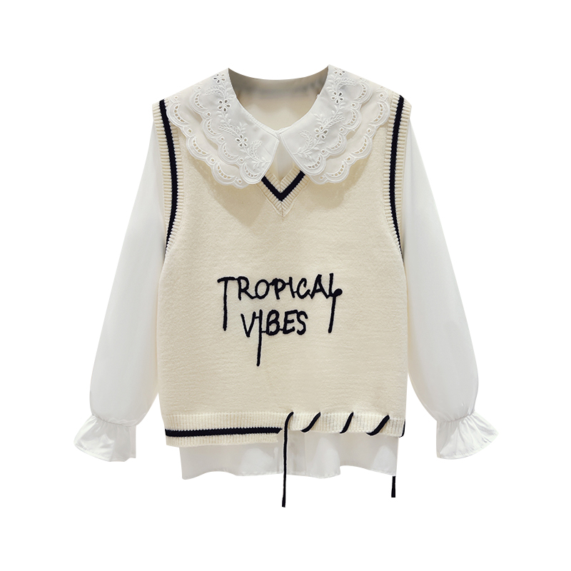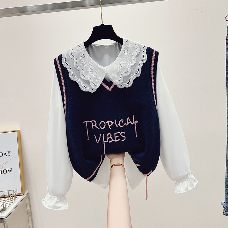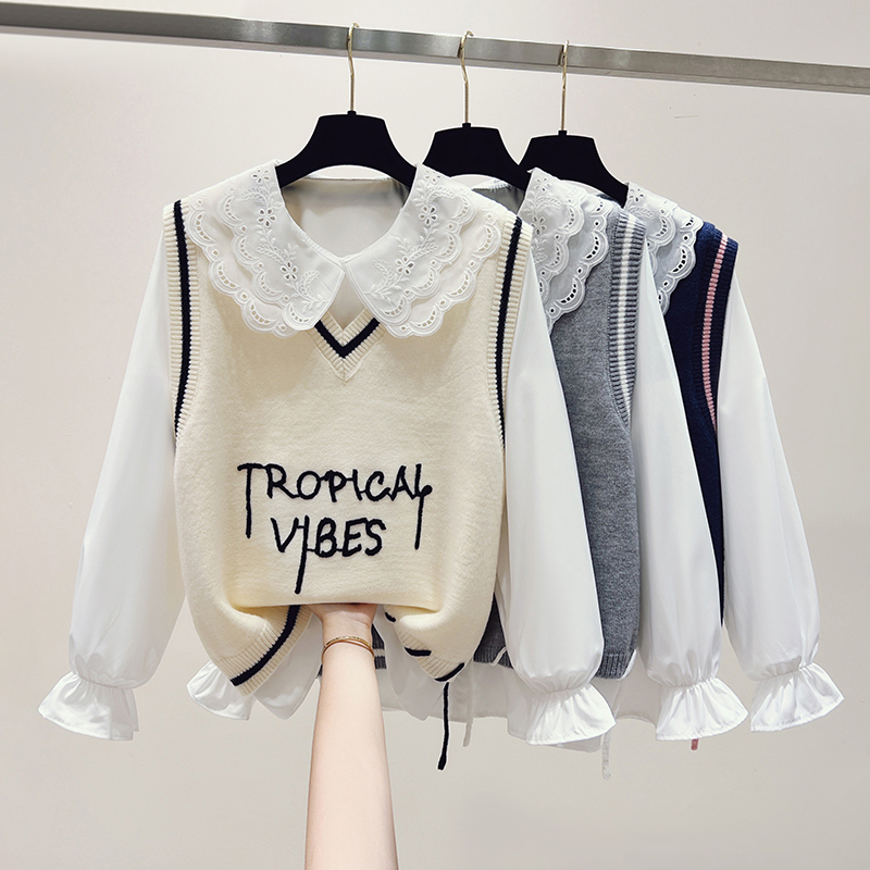 FA47358# 秋季新款小清新学院风重工针织马甲衬衫两件套时尚少女装 服裝批發女裝批發服飾貨源