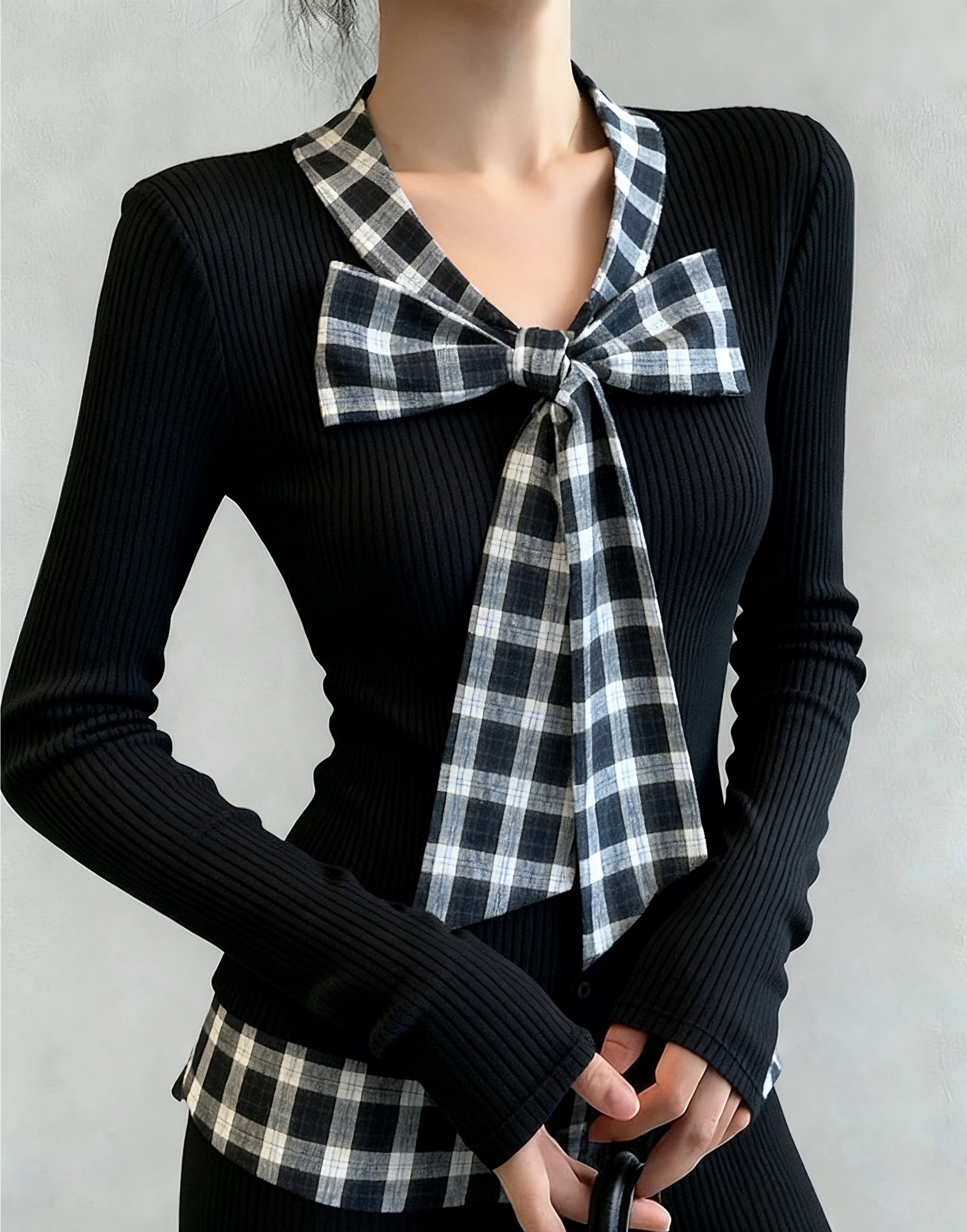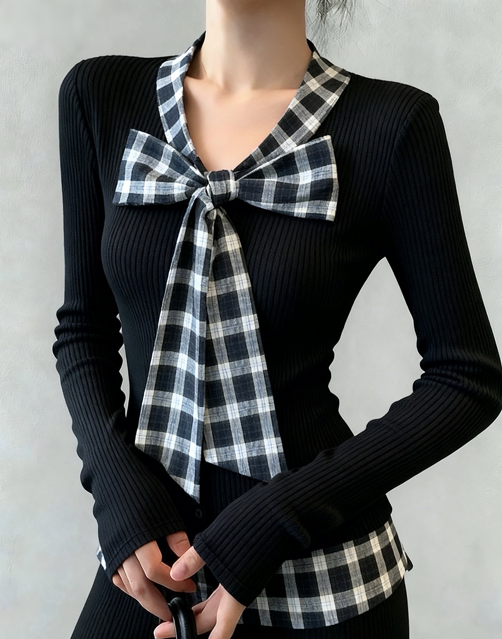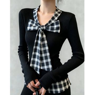 FA47371# 格纹学院韩系假两件拼格子系带蝴蝶结T恤 服裝批發女裝批發服飾貨源