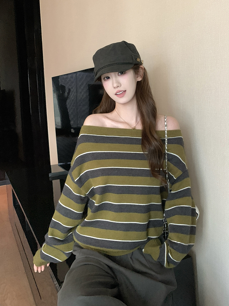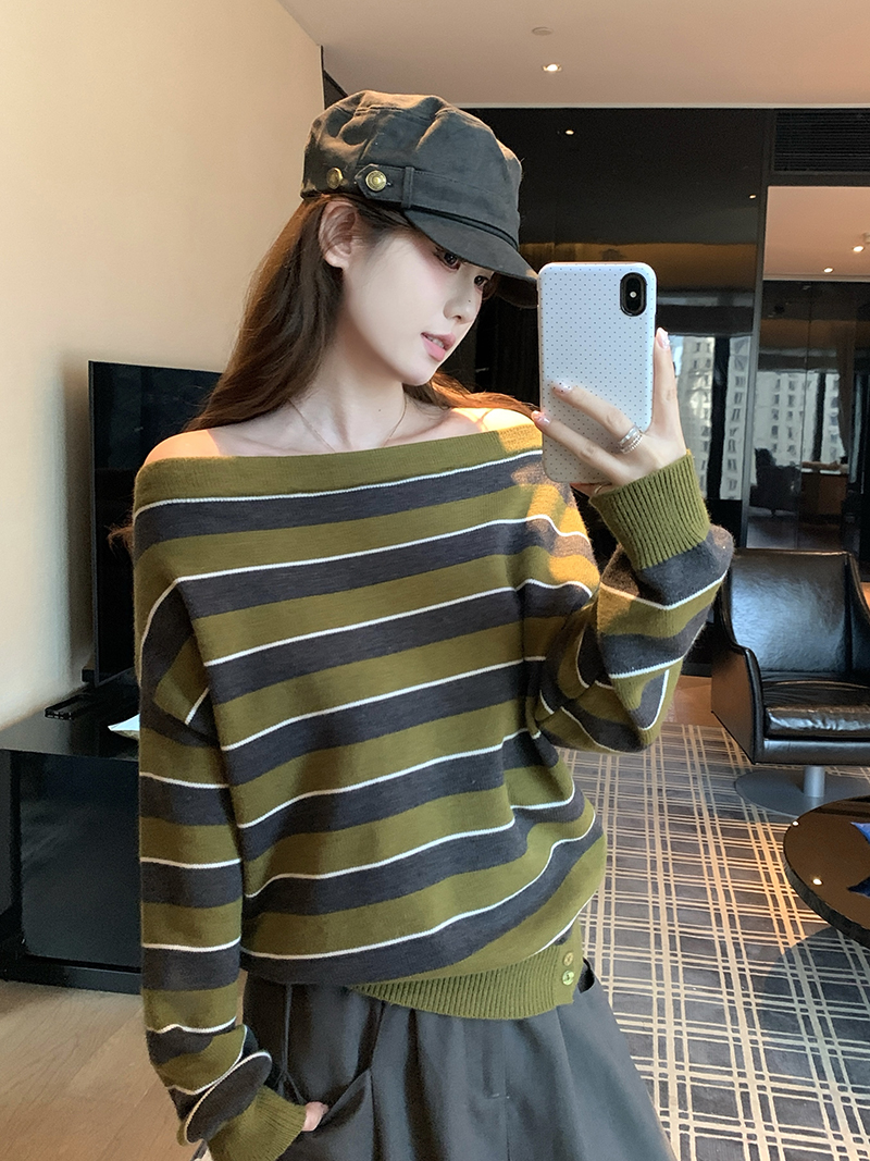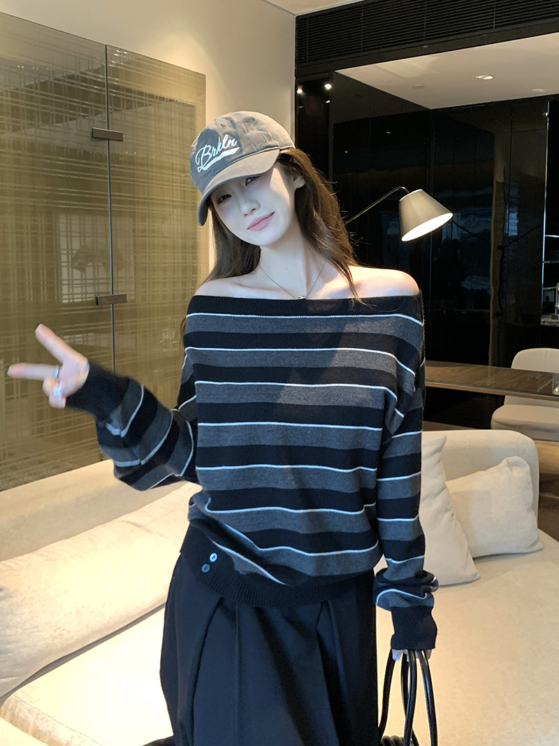 FA47387# 韩系斜领露肩撞色条纹针织上衣女 服裝批發女裝批發服飾貨源