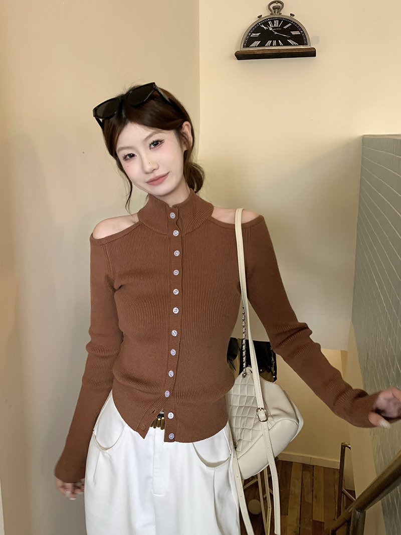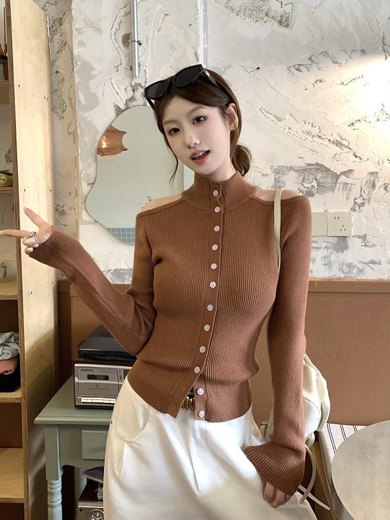 FA47390# 秋冬设计感镂空露肩咖色针织衫女 服裝批發女裝批發服飾貨源