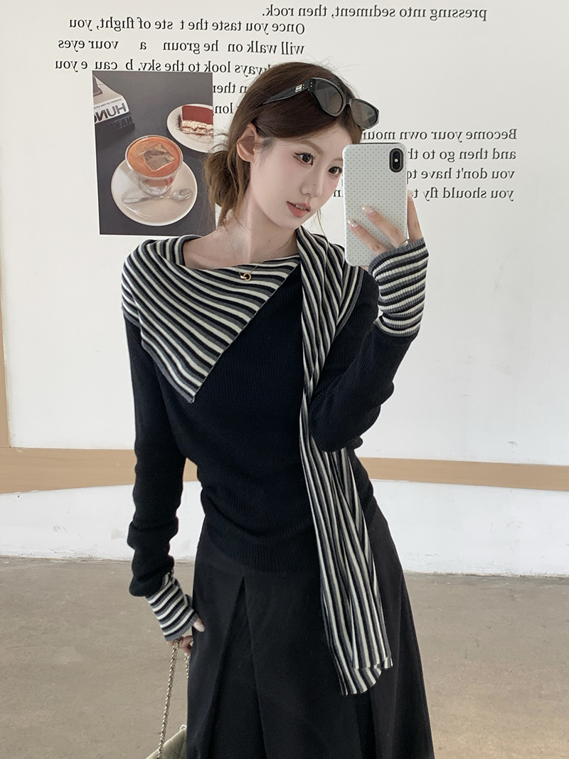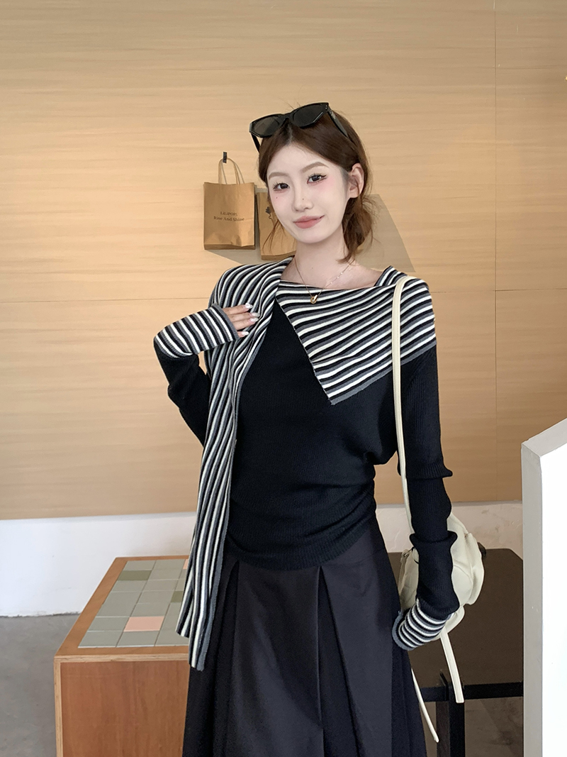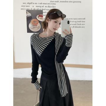 FA47391# 韩系巨好看的撞色条纹拼接飘带长袖T恤女 服裝批發女裝批發服飾貨源