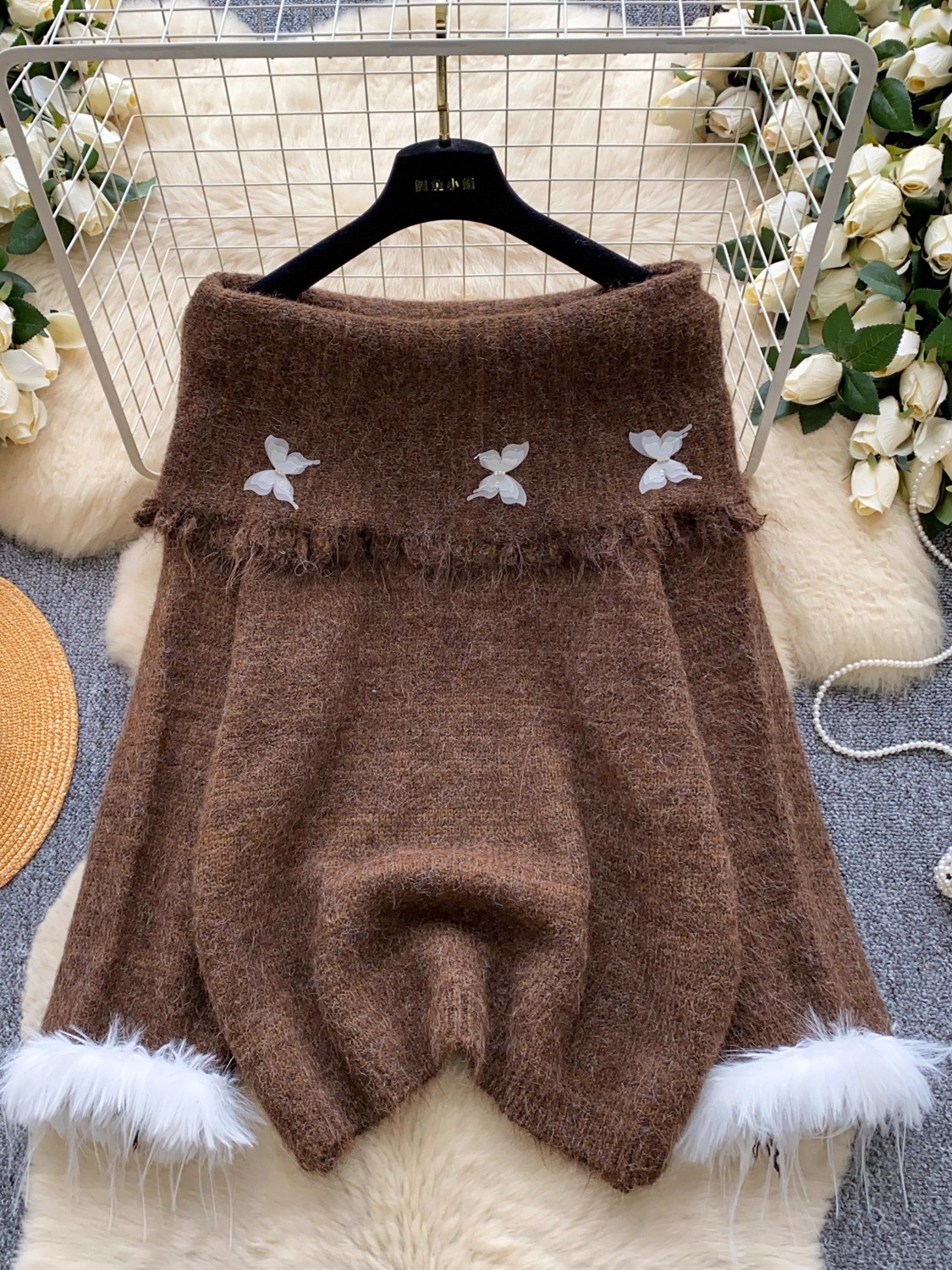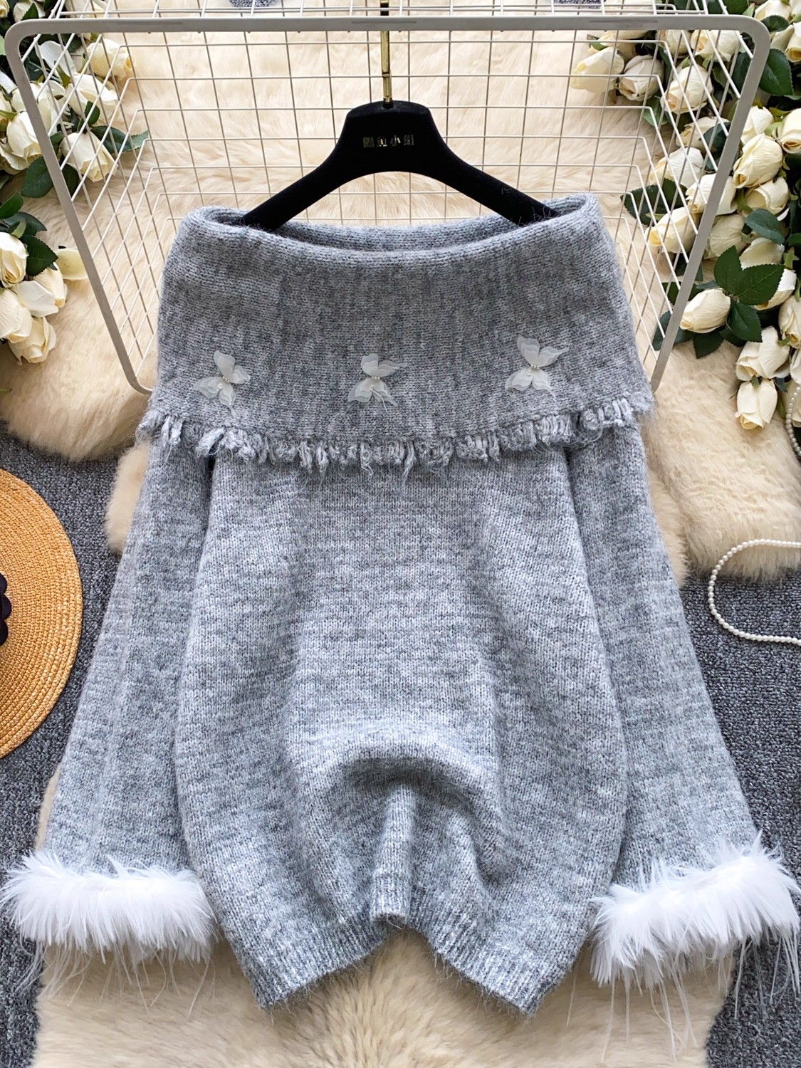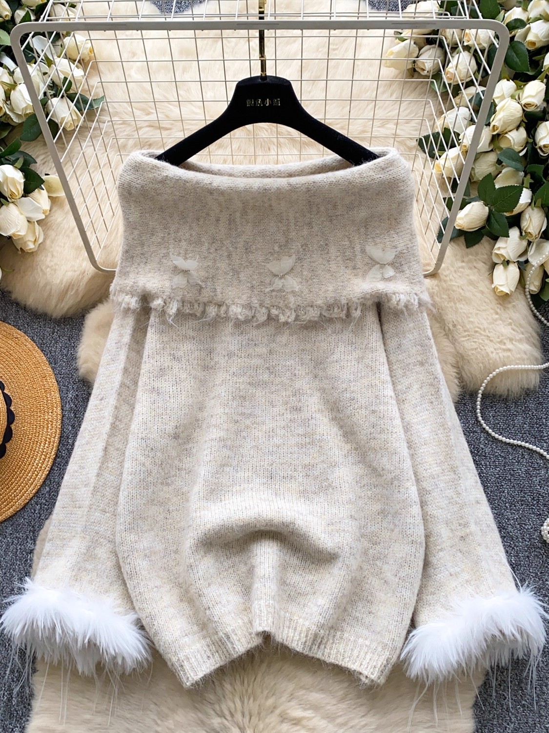 FA47393# 气质温柔风钉珠蝴蝶一字肩翻领毛毛拼接长袖针织衫女宽松毛衣上衣 服裝批發女裝批發服飾貨源