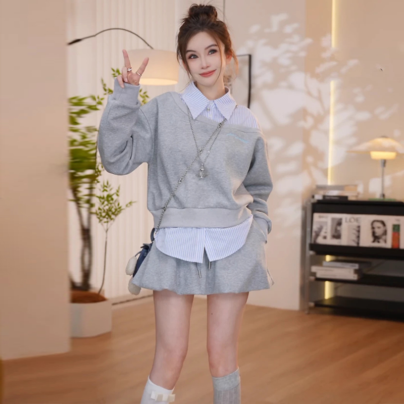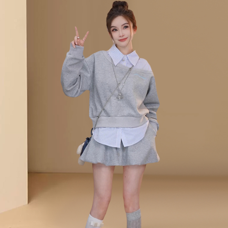 FA47518# 欧货衬衫拼接长袖卫衣春秋高级感时尚百搭上衣半裙套装 服裝批發女裝批發服飾貨源