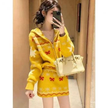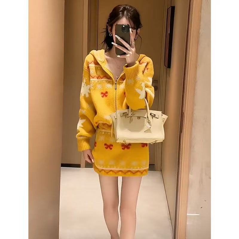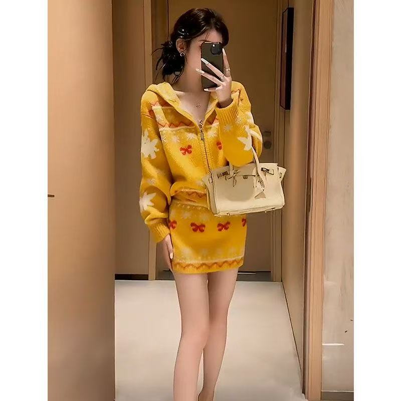 FA47557# 韩系一整套深冬穿搭黄色针织套装女新款慵懒提花上衣半身裙两件套 服裝批發女裝批發服飾貨源