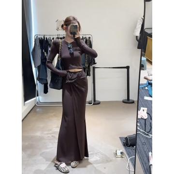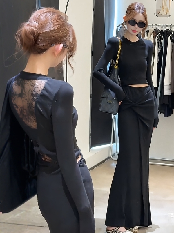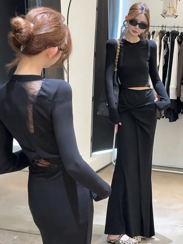 FA47745# 韩系气质镂空露背长袖T恤扭结半身裙两件套女早秋季新款时尚套装 服裝批發女裝批發服飾貨源