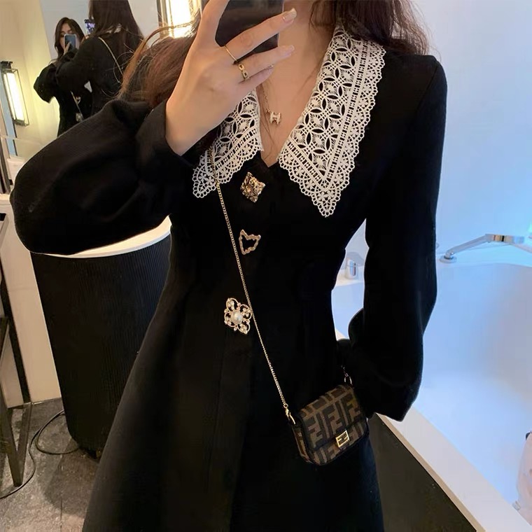 FA47756# 有娃娃领连衣裙女春秋收腰显瘦内搭打底裙子赫本风小黑裙 服裝批發女裝批發服飾貨源