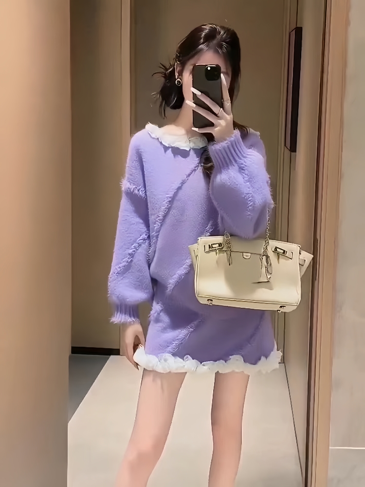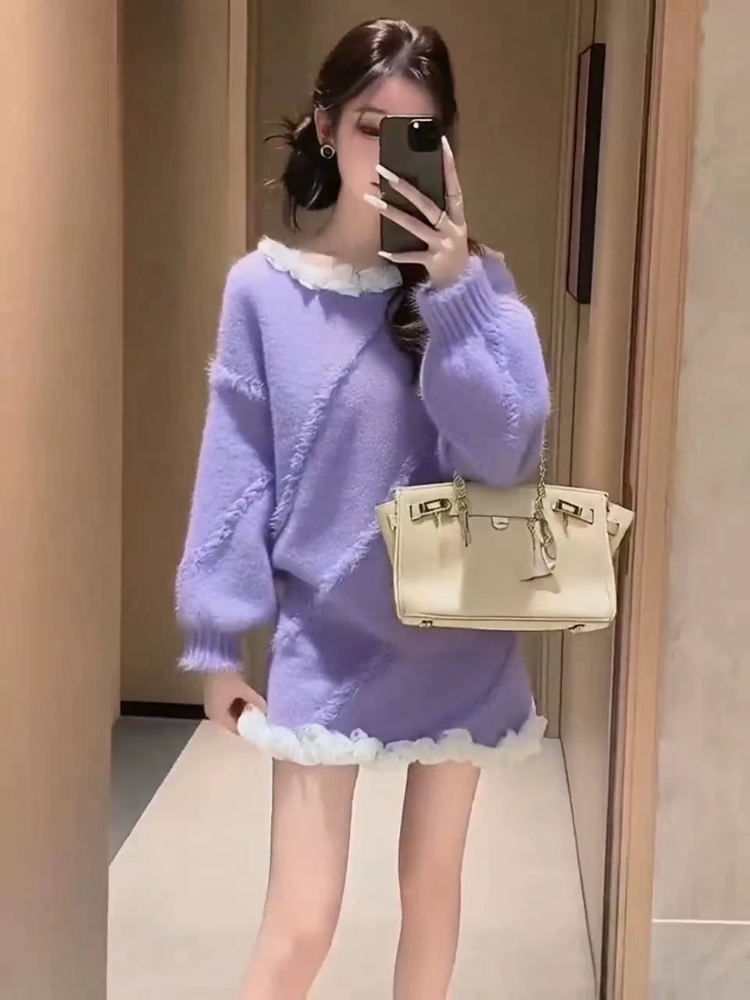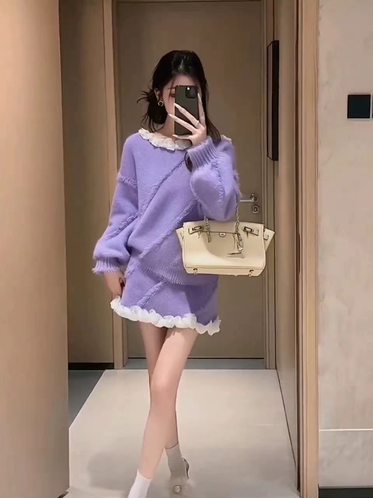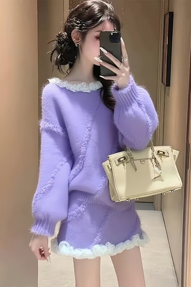 FA48511# 韩系紫色毛衣套装女新款穿搭巨好看减龄针织上衣半身裙两件套 服裝批發女裝批發服飾貨源