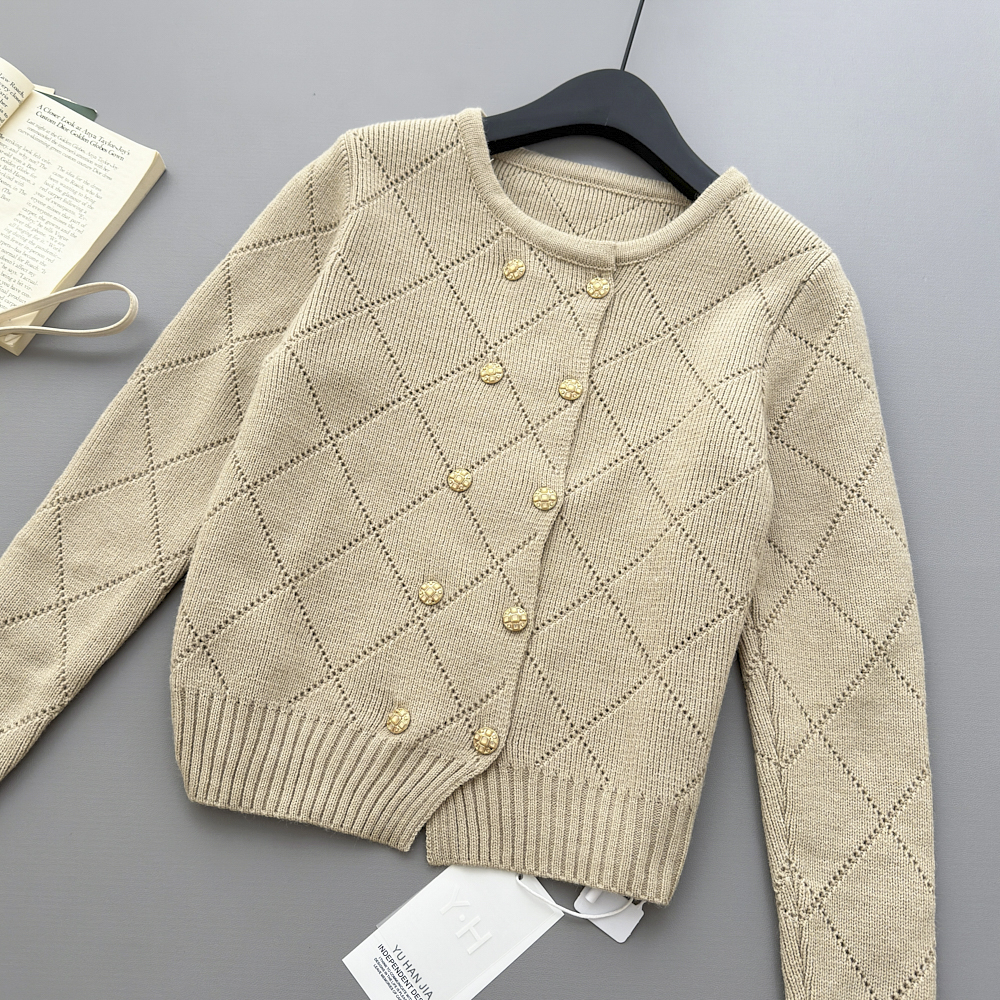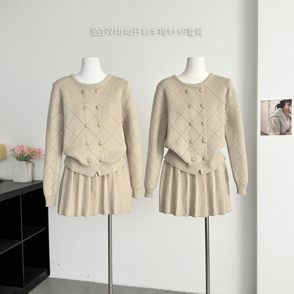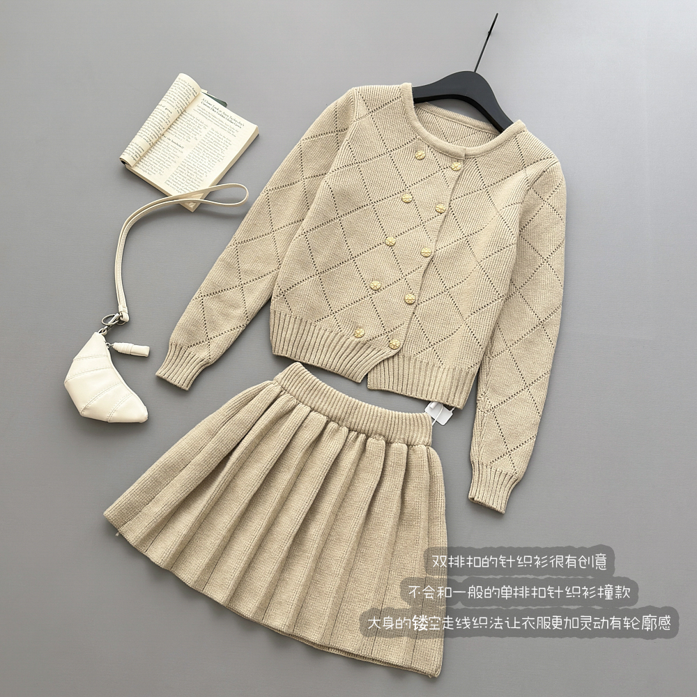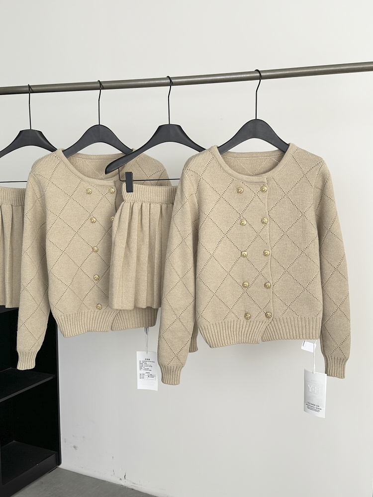 FA48923# 林子熙月下桂语精致琉璃扣针织套装显白双排扣开衫半裙 服裝批發女裝批發服飾貨源