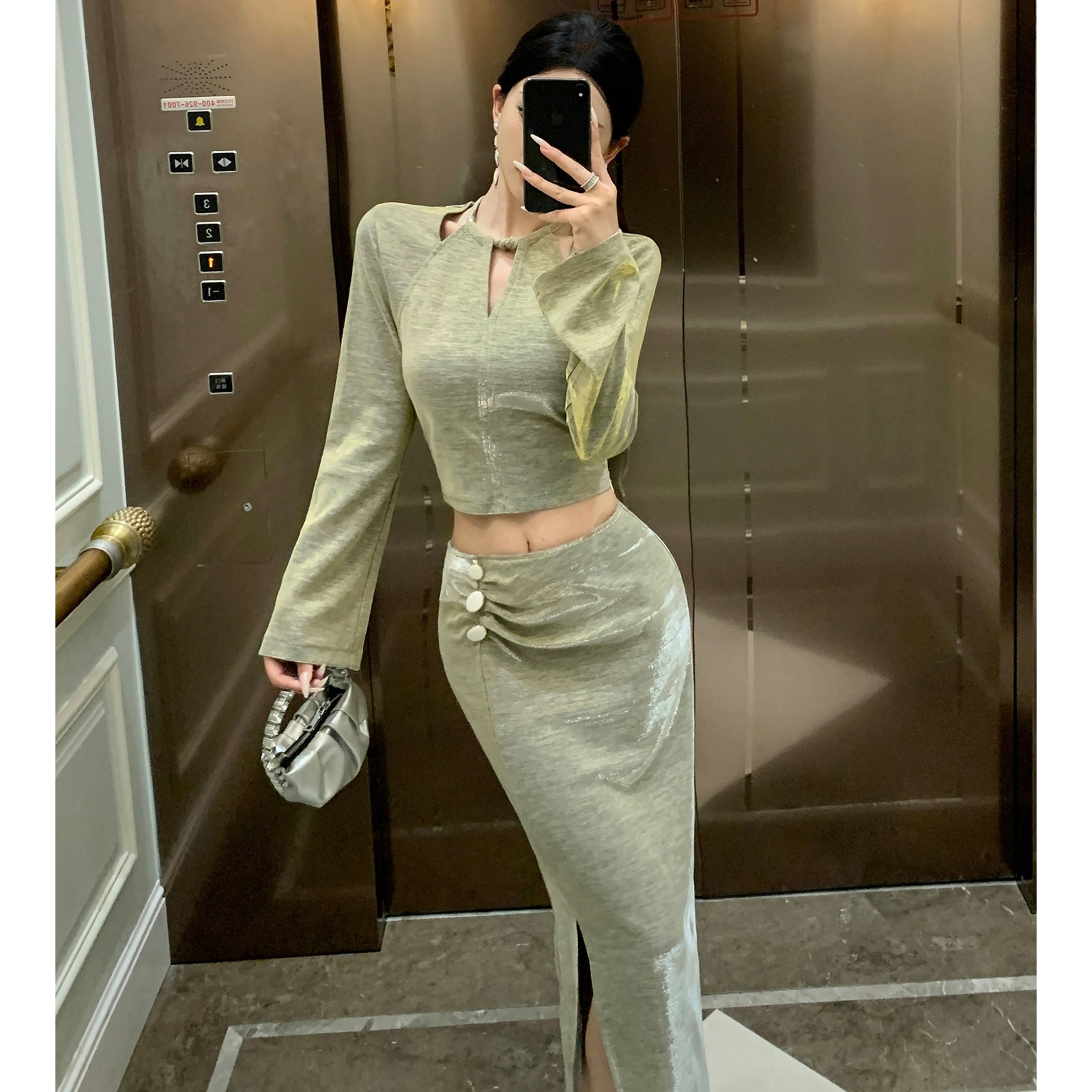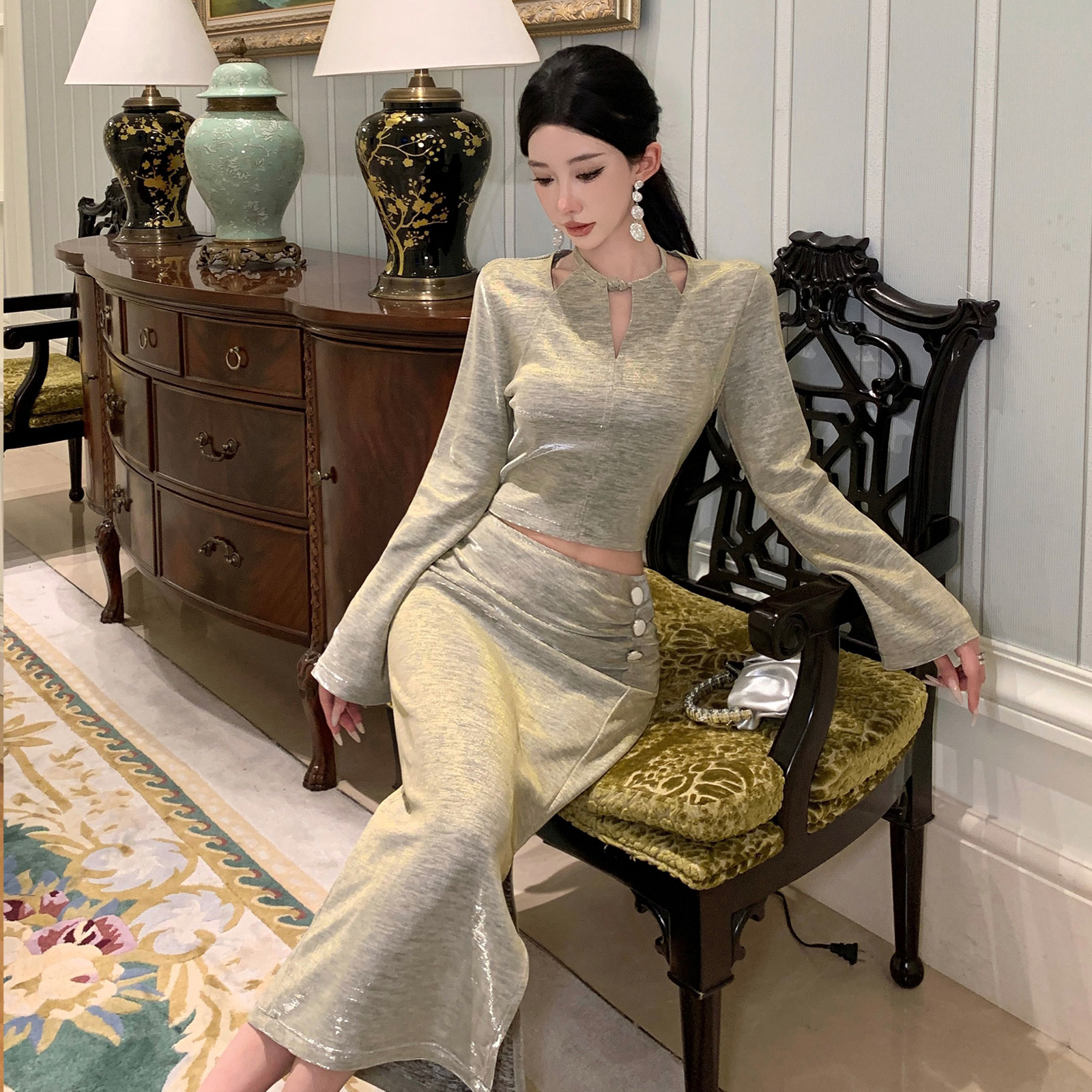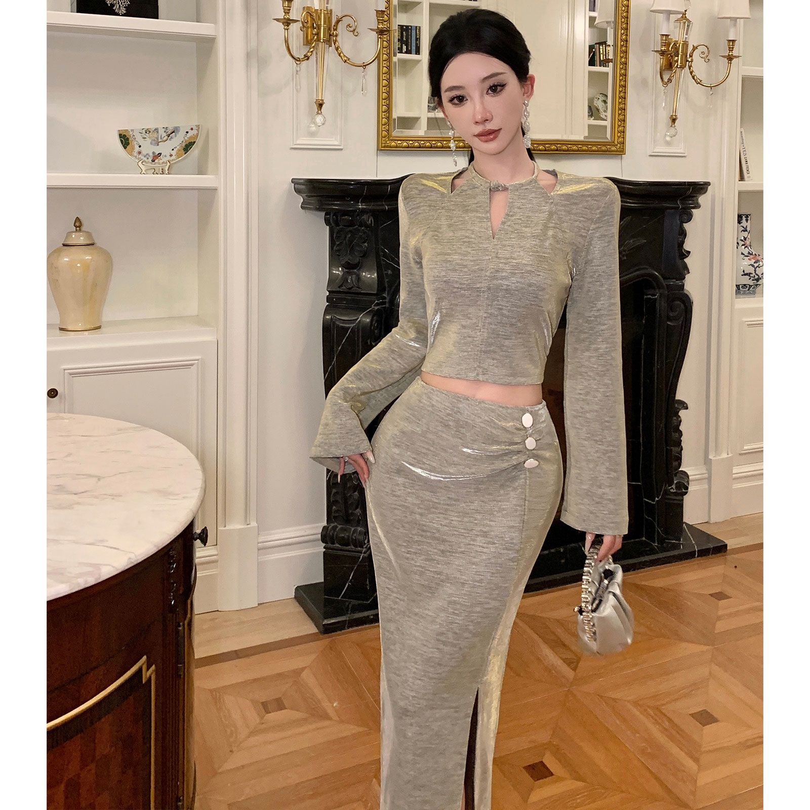 FA49051# 秋新款法式气质时尚设计感上衣高腰开叉半身裙精致高级感套装 服裝批發女裝批發服飾貨源