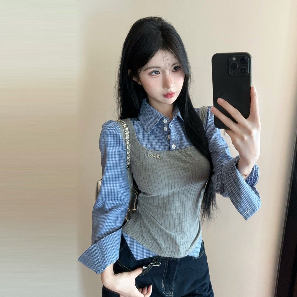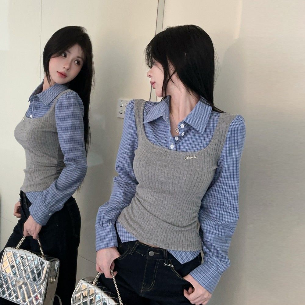 FA49528# 美式辣妹假两件格子拼接翻领长袖衬衫时尚复古气质百搭显瘦上衣女