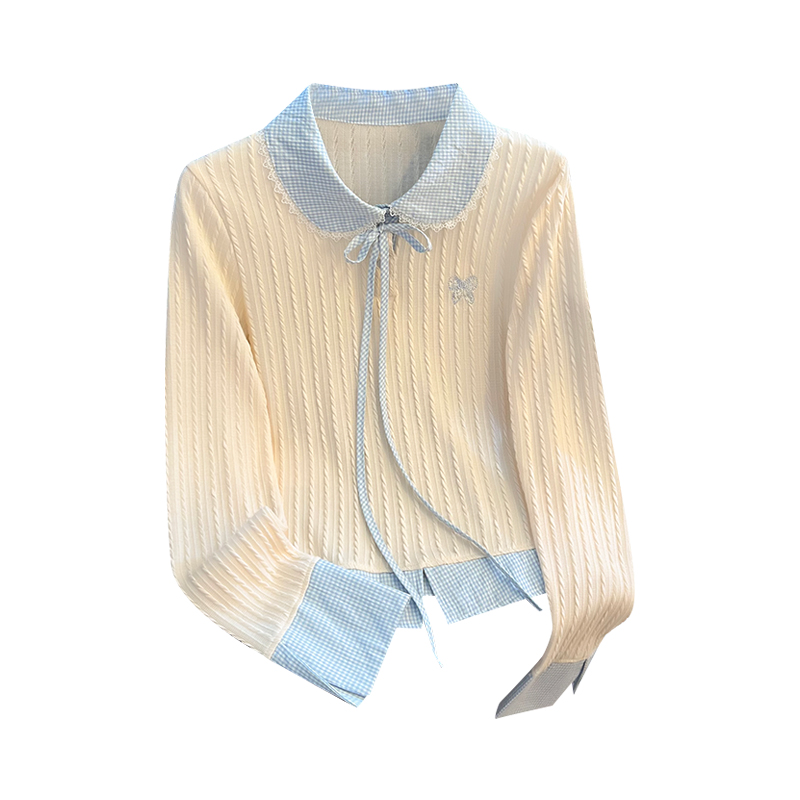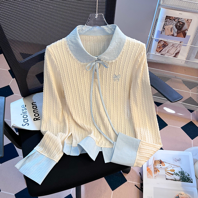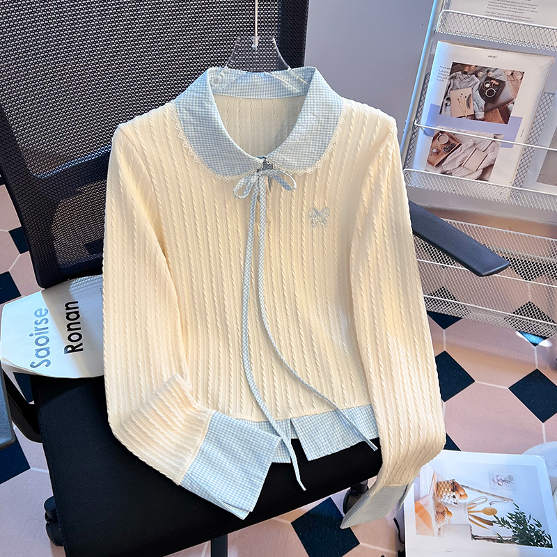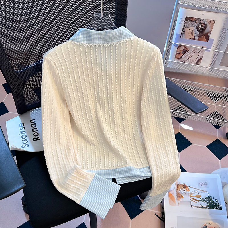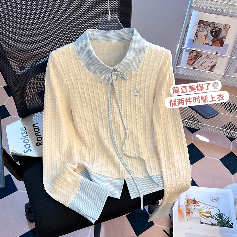 FA49571# 韩系格子拼接假两件长袖T恤女新款设计感修身百搭ins上衣