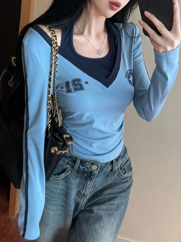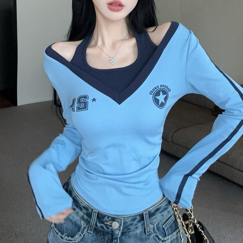 FA49690# 美式辣妹撞色拼接假两件长袖t恤女秋季甜酷印花挂脖露肩褶皱上衣